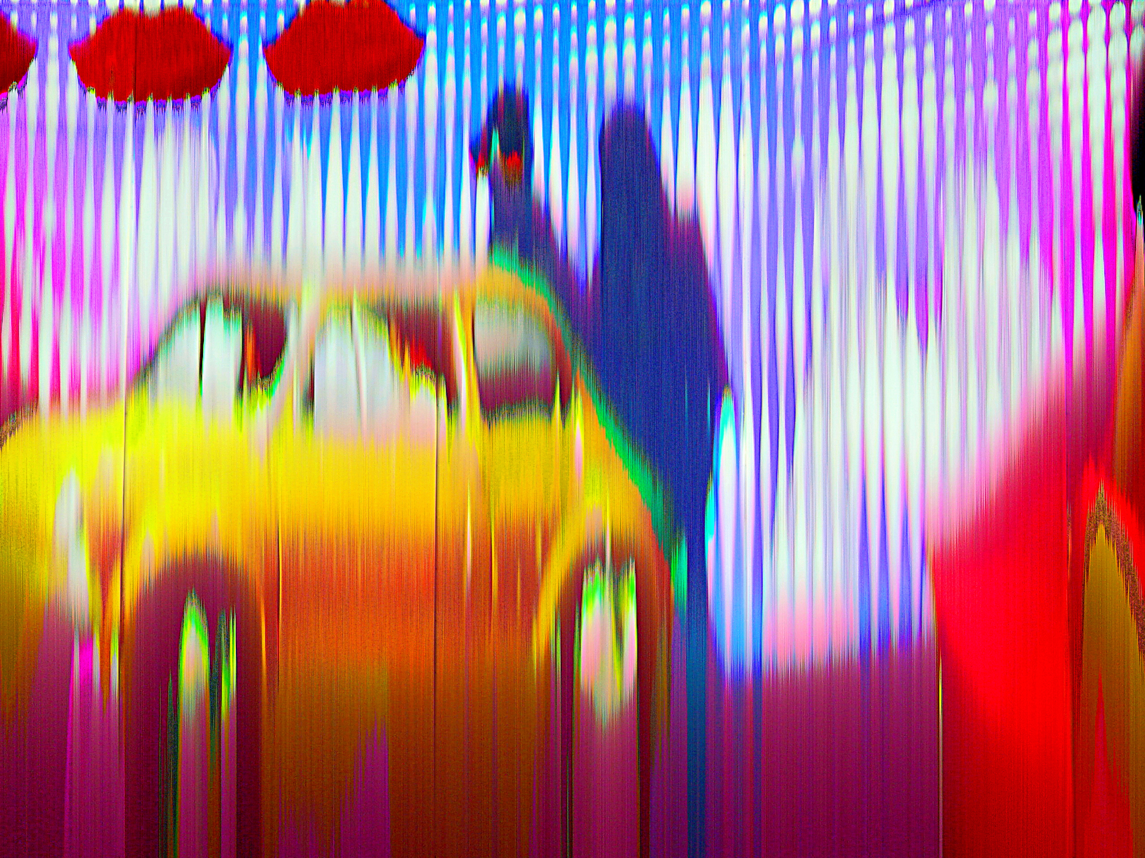 Ihre Blickrichtung zeigt entgegengesetzt zur Bewegung im Hintergrund, während der VW Käfer im Vordergrund im Kontrast zur Gegenwart im Hintergrund steht.