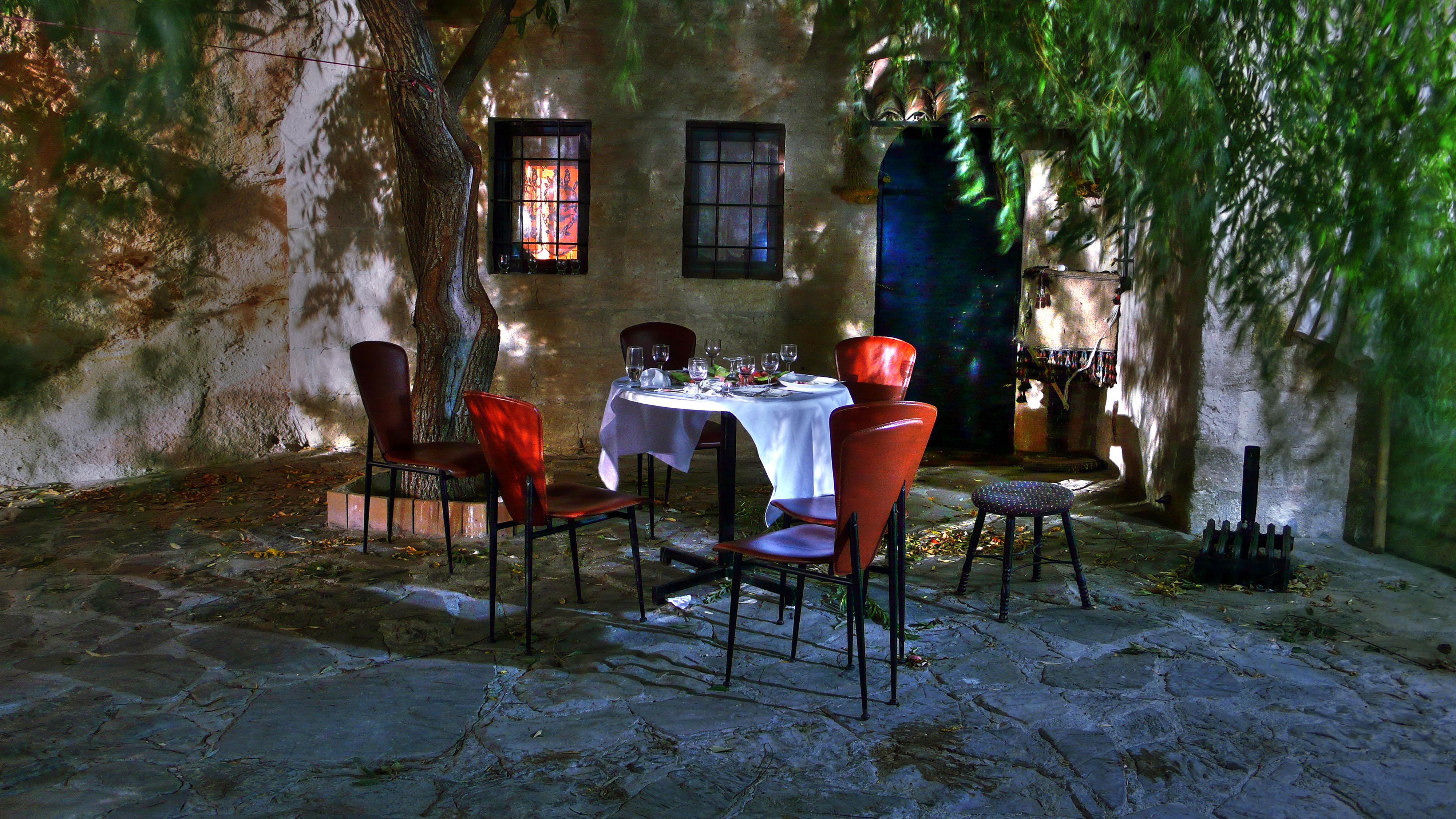 Ich entdeckte eine Gruppe Derwische in einem versteckten Hinterhof, welche sich dort vor Beginn der Veranstaltung noch mit türkischem Kaffee, etwas Brot und Wein stärkten. In dem Moment als ich unbemerkt von den Männern meine Kamera aus sicherer Entfernung postierte und die Belichtung einstellte, erklang plötzlich ein Gong, der den Beginn der abendlichen Veranstaltung einläuten sollte. Die Männer standen auf und verließen den Tisch durch die dahinter liegende blaue Tür. Zurück blieb dieser Moment eines verlassenen Tisches in einer vom Vollmond hell erleuchteten Nacht, während ein lauer Wind durch die Bäume streifte.