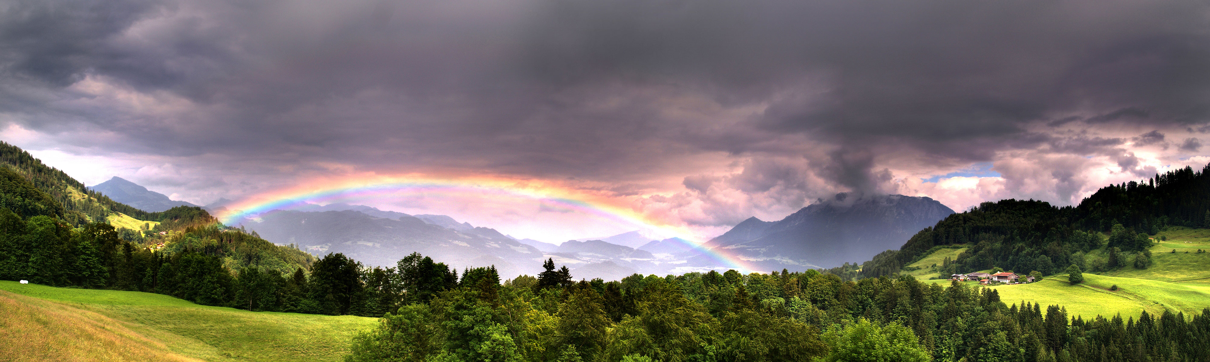 Während der Fahrt über die enge Straße entsandt plötzlich aus dem Nichts dieser atemberaubende, über mehrere Kilometer sich erstreckende Regenbogen über dem Tal in Richtung Oberaudorf und Wall. Der Regenbogen war so groß, dass ich trotz Weitwinkel eine Reihenaufnahme auf Stativ machen musste um die gesamte Schönheit des Tals samt Regenbogen aufnehmen zu können. Ich bemerkte dabei gar nicht, dass sich hinter mir auf der schmalen Straße eine Schlange an Fahrzeugen bildete, da ich in der Eile um das Motiv noch einfangen zu können mein Auto quer auf der Fahrbahn abstellte und sogar noch die Fahrertüre offen ließ.