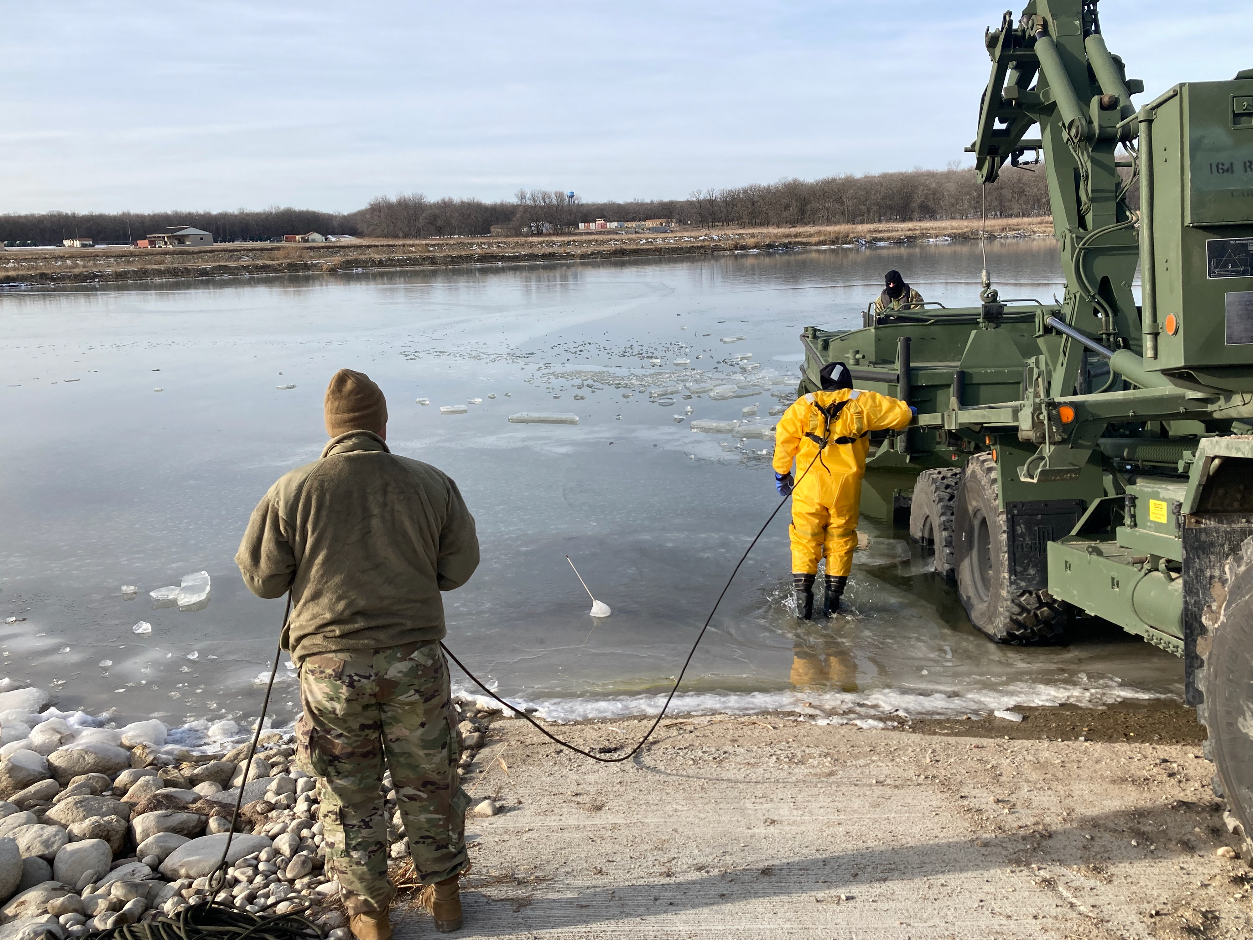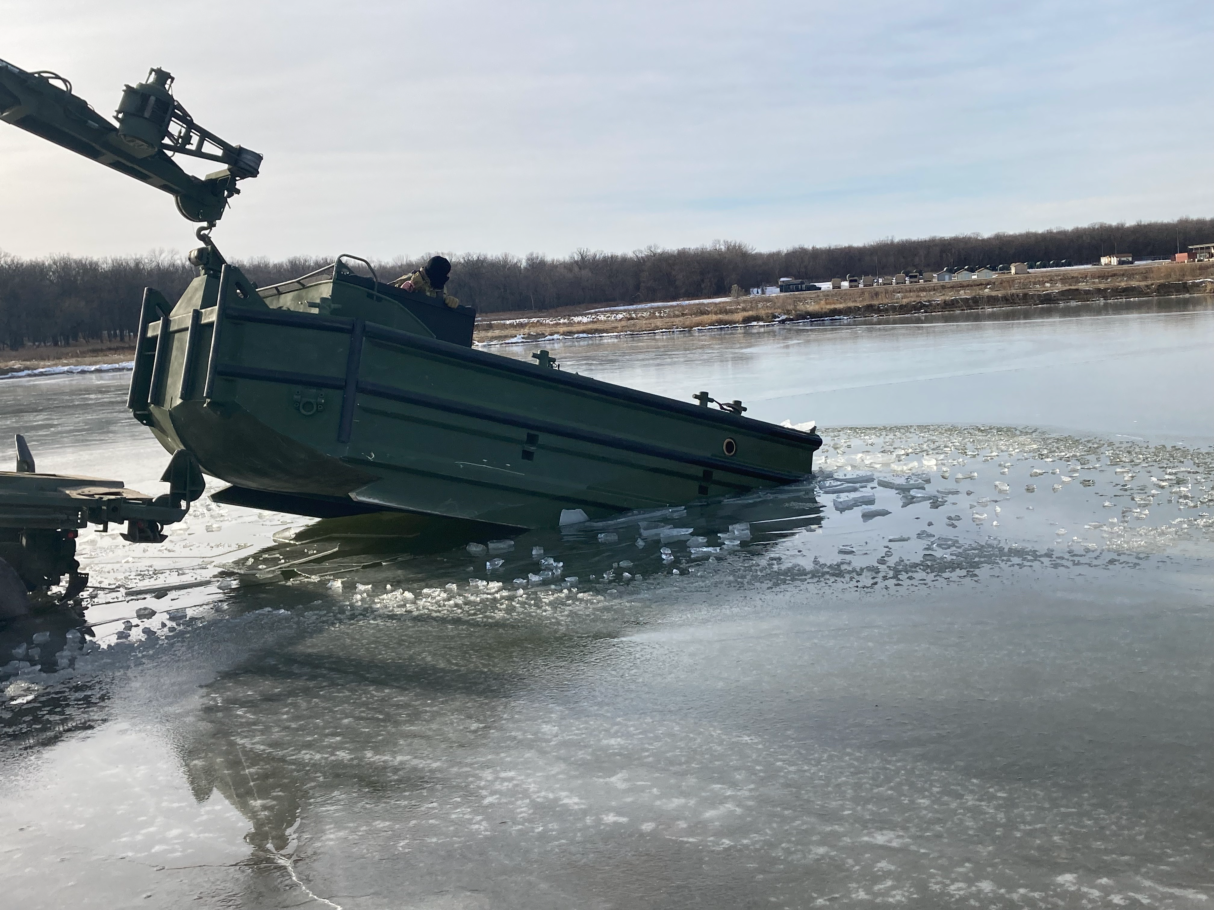 Colonel Russ Wolf, commander of the N.D. National Guard's 164th Regional Training Institute (RTI), directed the RTI's engineer instructors to develop cold-weather bridging operations, utilizing the M30 Bridge Erection Boat (BEB) and Improved Ribbon Bridge (IRB). (National Guard story and photos by Master Sgt. Brian Schmoker, operations noncommissioned officer in charge, 164th Regional Training Institute)