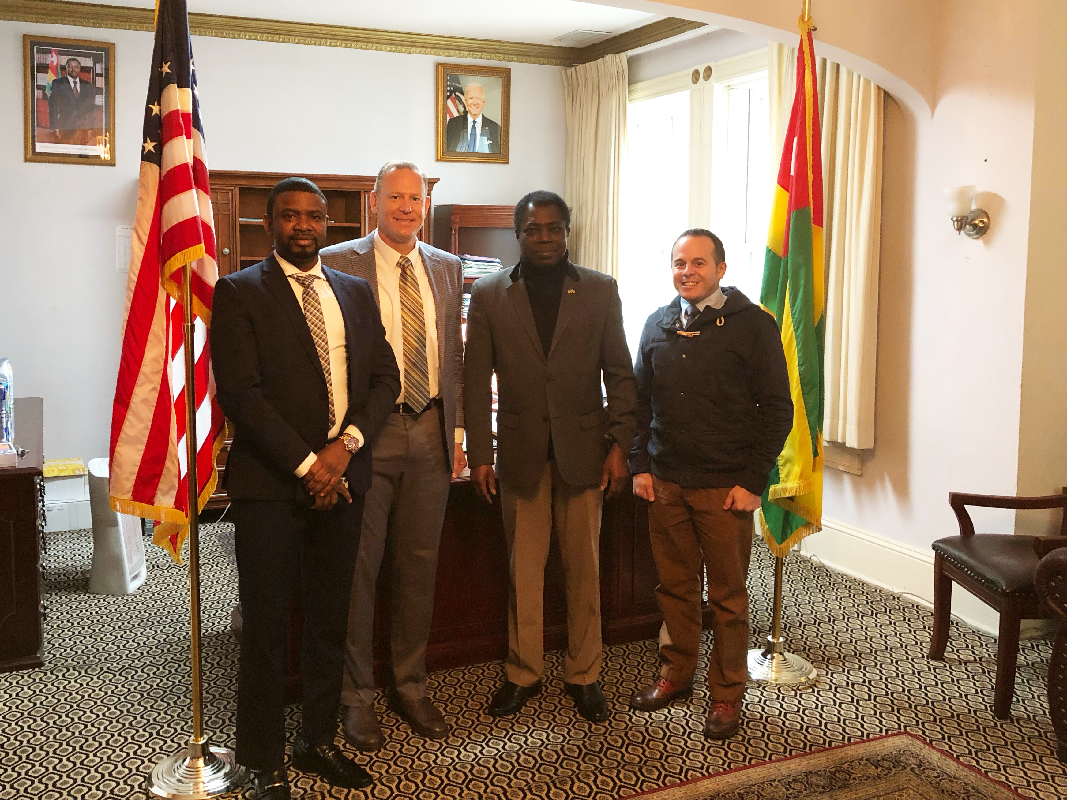 The Togolese Republic's ambassador to the U.S., the honorable Frédéric Edem Hegbe, second from right, hosts visitors at the Togo embassy in Washington, D.C., Nov. 30, 2021. From left, Mo Dambre, Pentagon African affairs analyst; Lt. Col. Mark McEvers, director, N.D. National Guard's State Partnership Program; Hegbe; and Capt. Jeremiah Colbert, 119th Wing. Colbert will be assigned as N.D. National Guard's first bilateral affairs officer assigned to the U.S. Embassy in Lome, Togo, summer 2022.