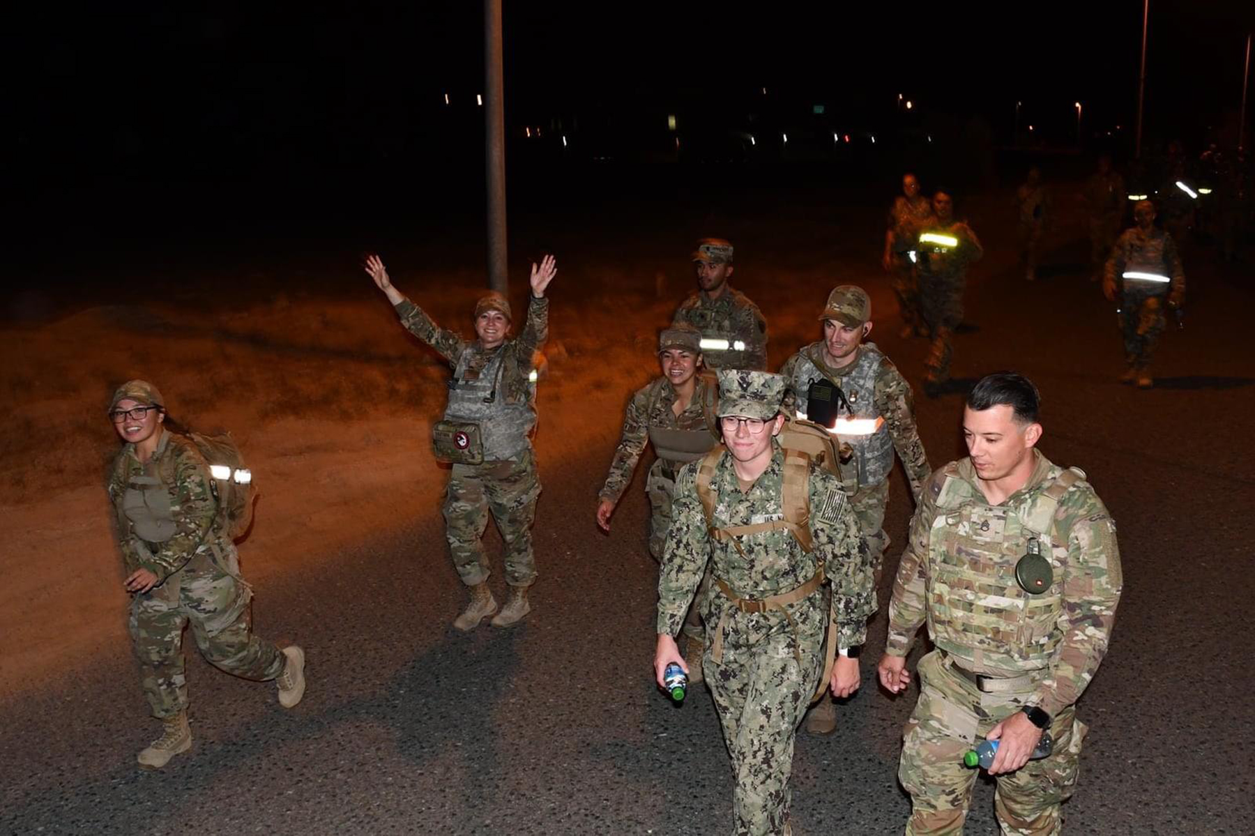 “It was a lot of fun! People carried flags of their home units, glow sticks, head lamps, and played music,” said Senior Master Sgt. Erica Carruth, the 119th Military Personnel Flight superintendent, who is serving as the 386th Expeditionary Force Support Squadron PERSCO team chief. “It was great to visit with all the other participants, and I even bumped into other deployed Hooligans on the course.”