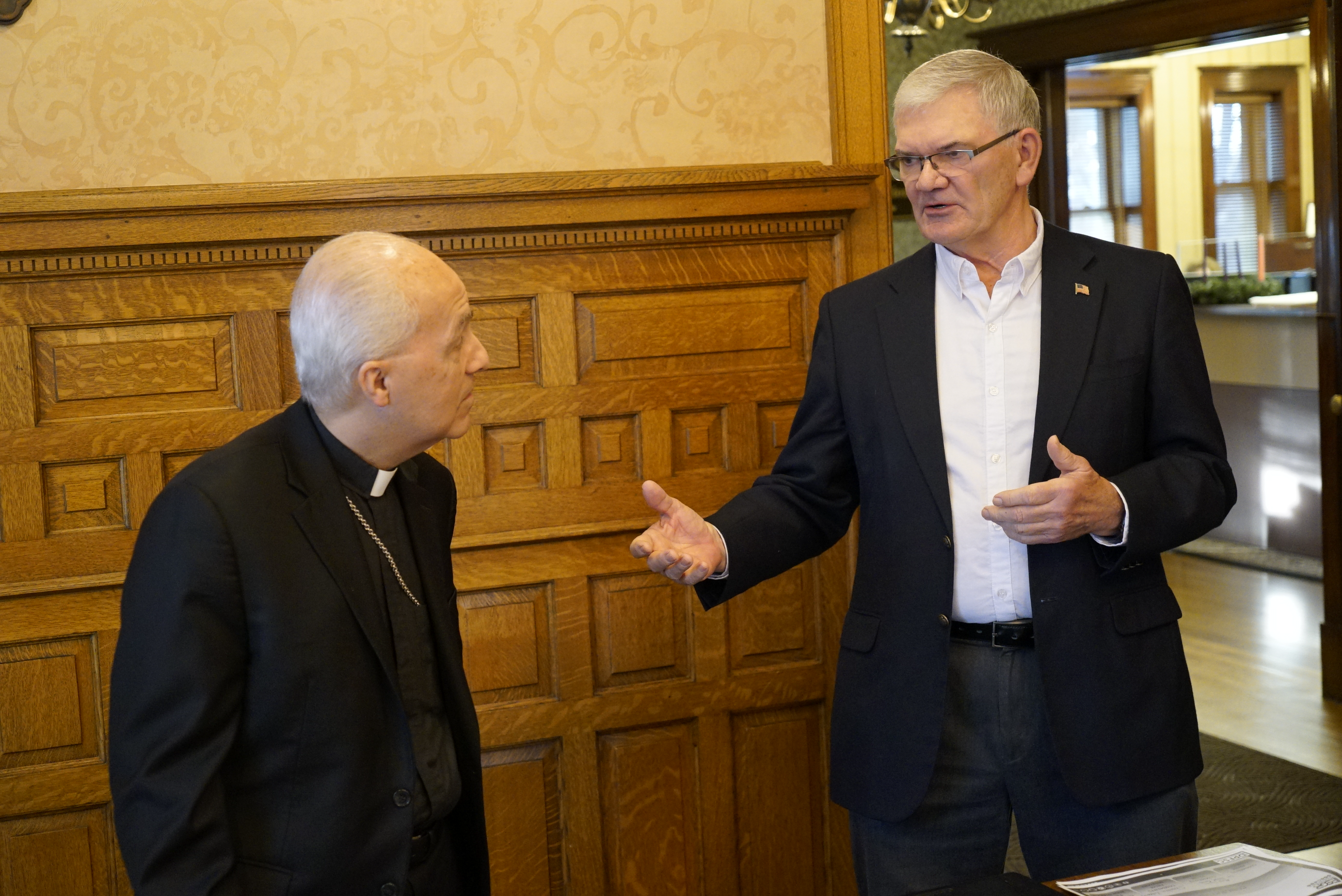 Bishop David Kagan, Diocese of Bismarck, was awarded the ESGR (Employer Support of the Guard and Reserve) Service Member Patriot Award, Bismarck, N.D., Nov. 30, 2021. Chaplain (Capt.) Justin Waltz nominated the bishop in recognition of his support of Waltz's military service in the N.D. National Guard. (National Guard story and photos by Sgt. 1st Class Charles Highland, N.D. National Guard Public Affairs)
