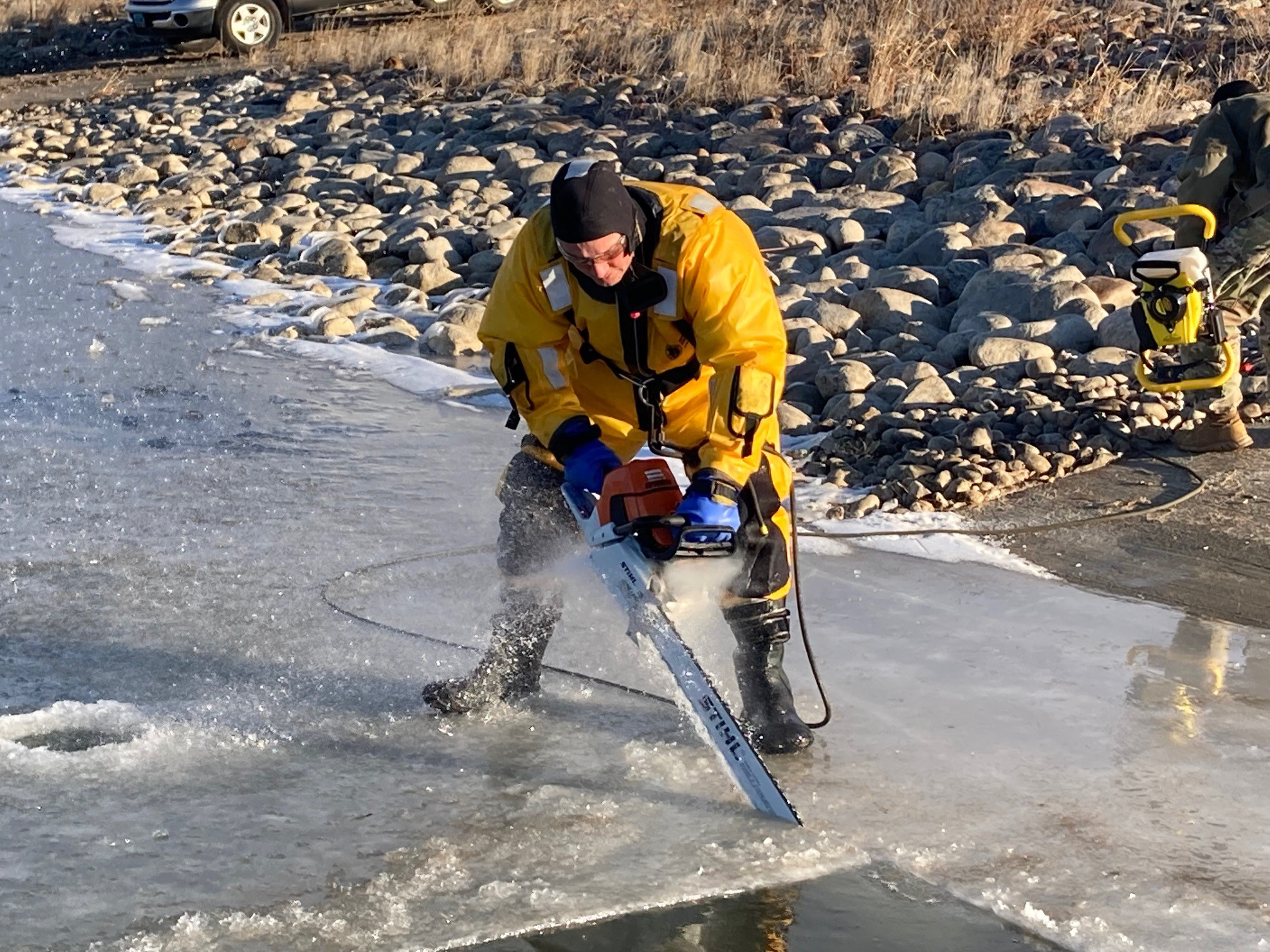 The engineers began by cutting a square section of ice by chainsaw. Once the chunk of ice is removed, the opening will allow the Common Bridge Transporter to back into the waters and launch an M30 BEB.