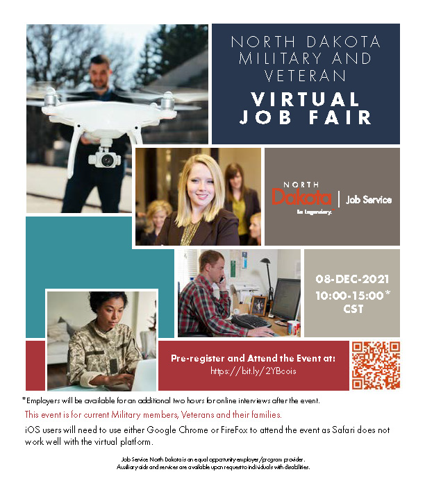 Job Service North Dakota will host a Military and Veteran Virtual Job fair, Wednesday, Dec. 8 from 10 a.m. to 3 p.m. The virtual job fair is for all current military members, veterans, and their families. There is no cost to attend. (Story by Sarah Arntson, Job Service North Dakota's Communications Officer)