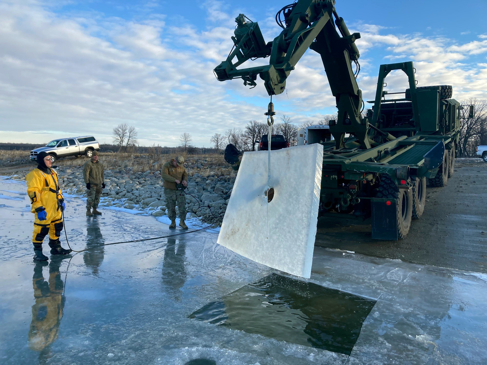 Top: From left, Staff Sgt. Brent Mittleider, Capt. Jakob Oster and Sgt. 1st Class Elliott Larman remove a block of ice from Richie Slough with a U.S. Army Common Bridge Transporter (CBT). Removing the block of ice will allow the CBT to launch an M30 Bridge Erection Boat into the water. The Soldiers, assigned to the 164th Regional Training Institute, are conducting tests to help determine tactics, techniques, and procedures for ice-bridging operations. (National Guard photo by Master Sgt. Brian Schmoker, operations noncommissioned officer in charge, 164th Regional Training Institute)
