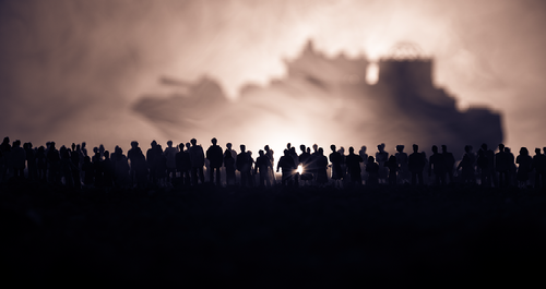 Creato con immagini di zef art - "Silhouettes of a crowd standing at blurred military war ship on foggy background. Selective focus. Passengers try to escape." • sezer66 - "Escape"