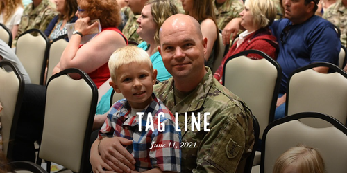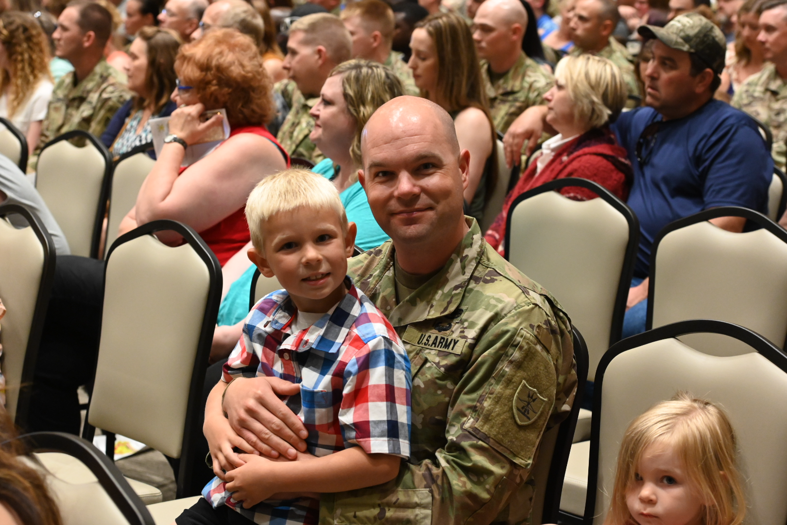 First Sergeant David Saari, Shooter Battery, 1st Battalion, 188th Air Defense Artillery Regiment, holds his son during his unit's sendoff ceremony, at the Alerus Center, Grand Forks, N.D., June 5, 2021. (National Guard photo by Jon Haugen, N.D. National Guard Visual Information)