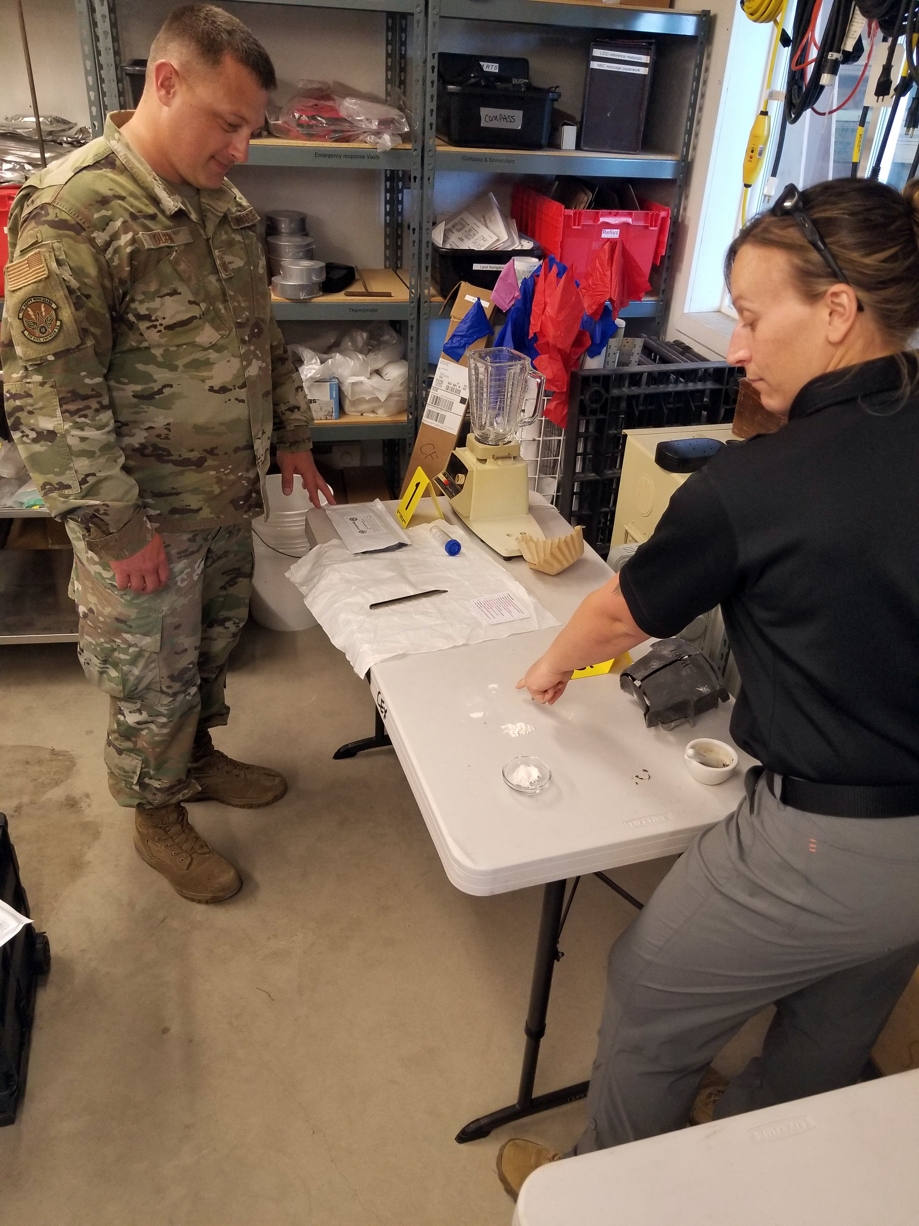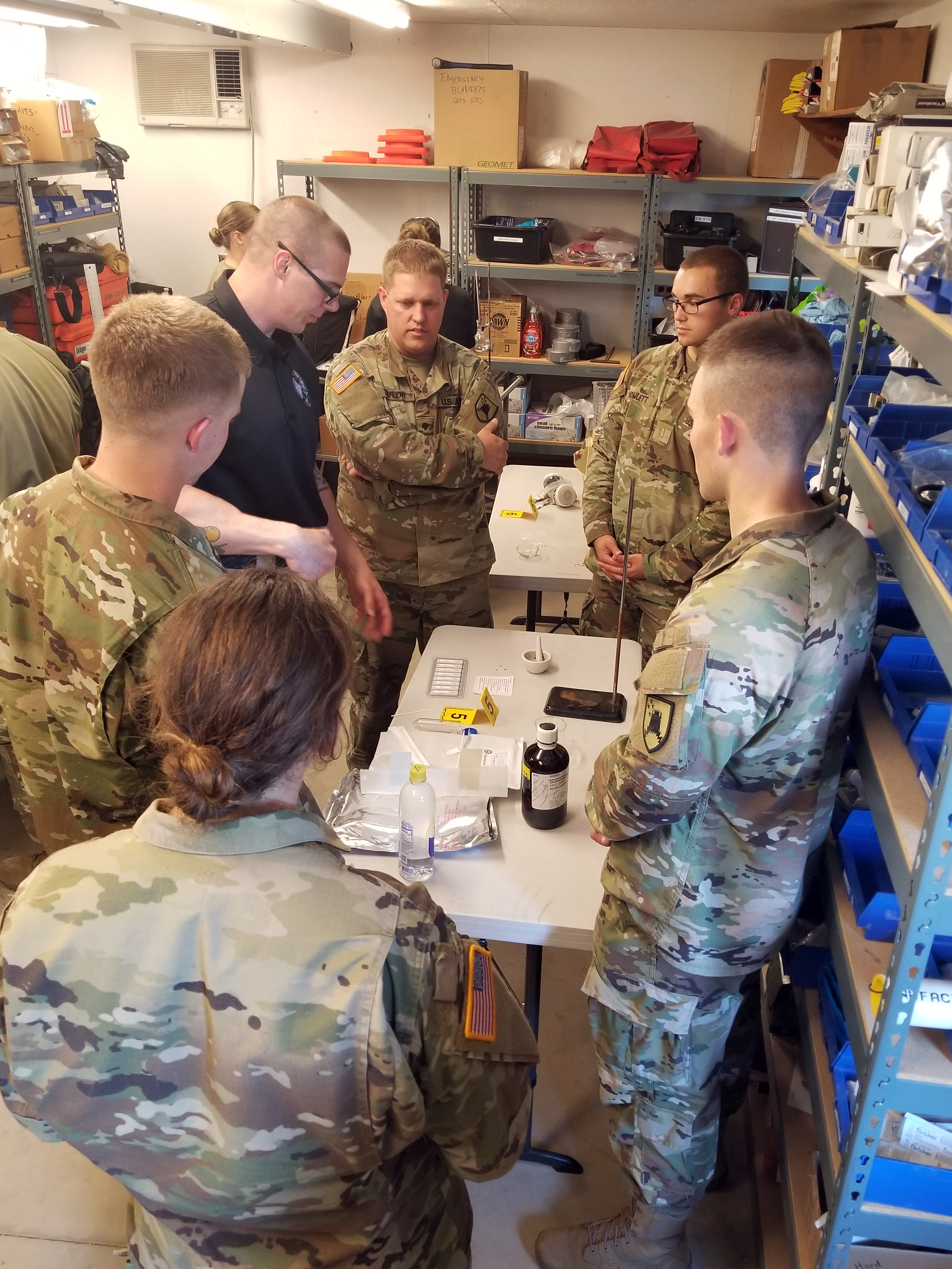 Later in the day, the 81st CST members and the Hooligans trained five Soldiers assigned to the 141st Maneuver Enhancement Brigade in CRBN. The CST members demonstrated updated concepts of operations (CONOPS) for response and mitigation of a potential clandestine lab as well as radiological response actions.