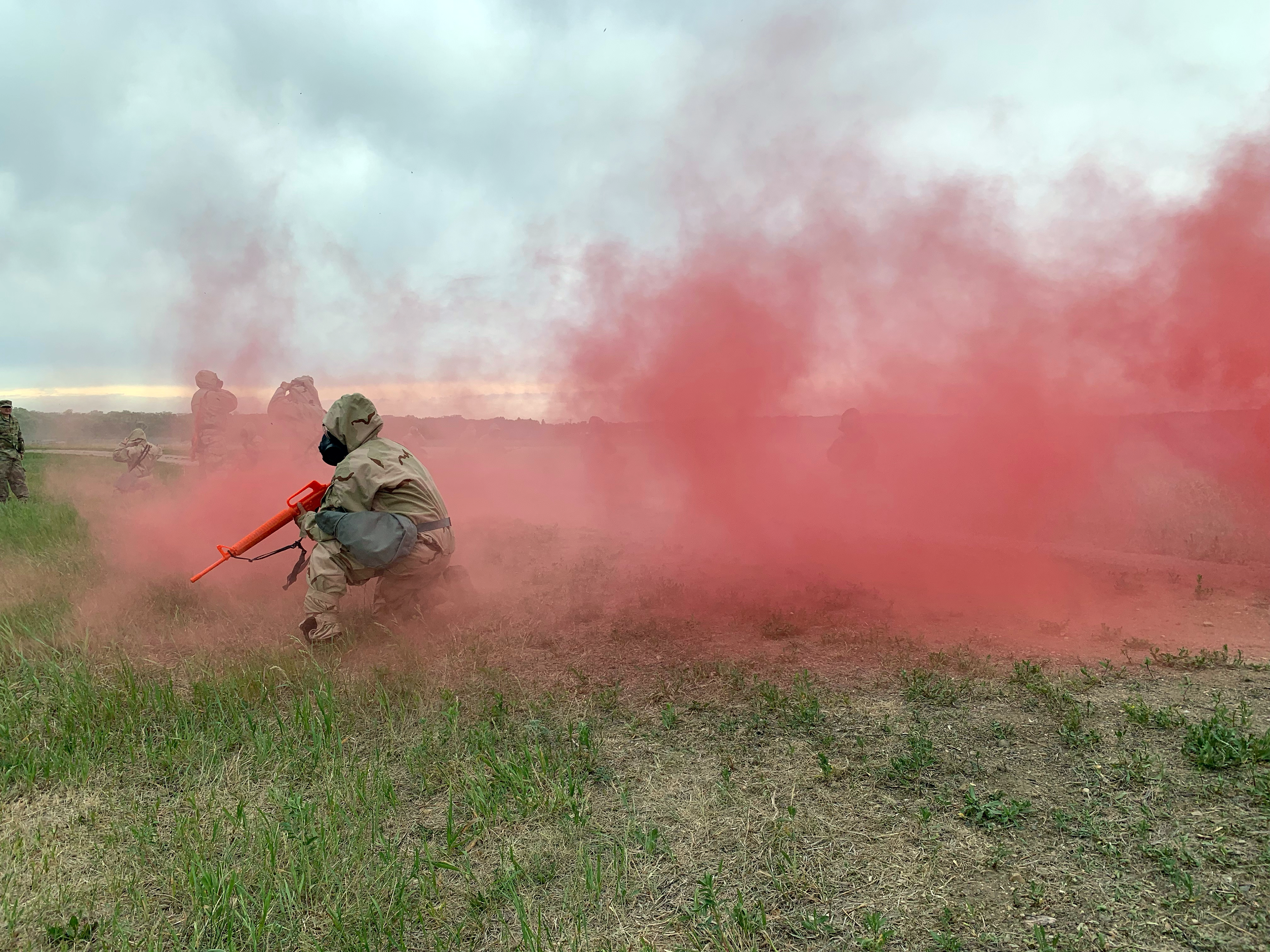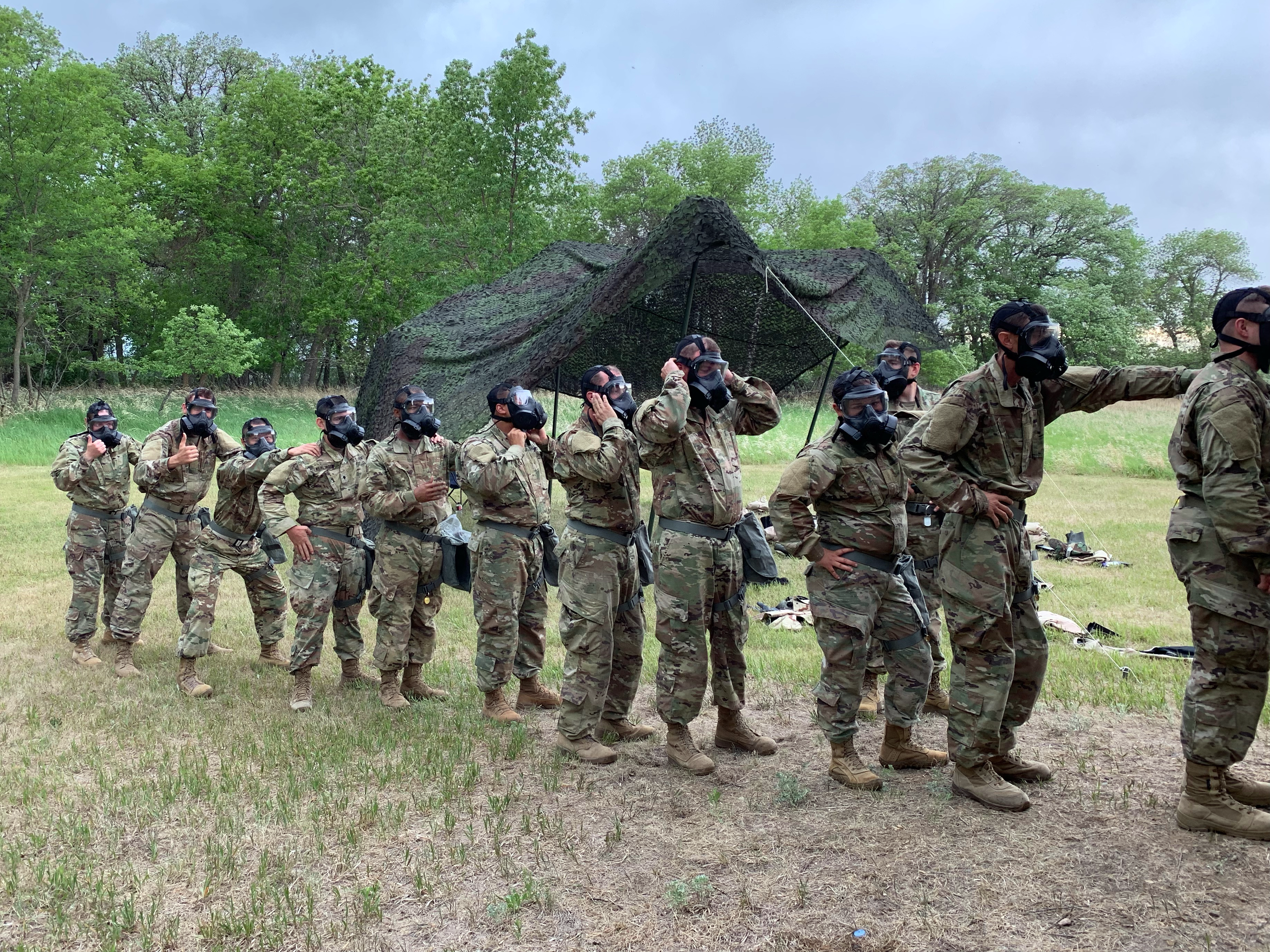 After exiting the gas chamber Soldiers of the 835th Engineer Utilities Detachment are guided to a safe area where they are instructed on how best to reduce the effects of the CS teargas. Soldiers learn to continue moving and flap their arms to remove excess gas from their uniforms.