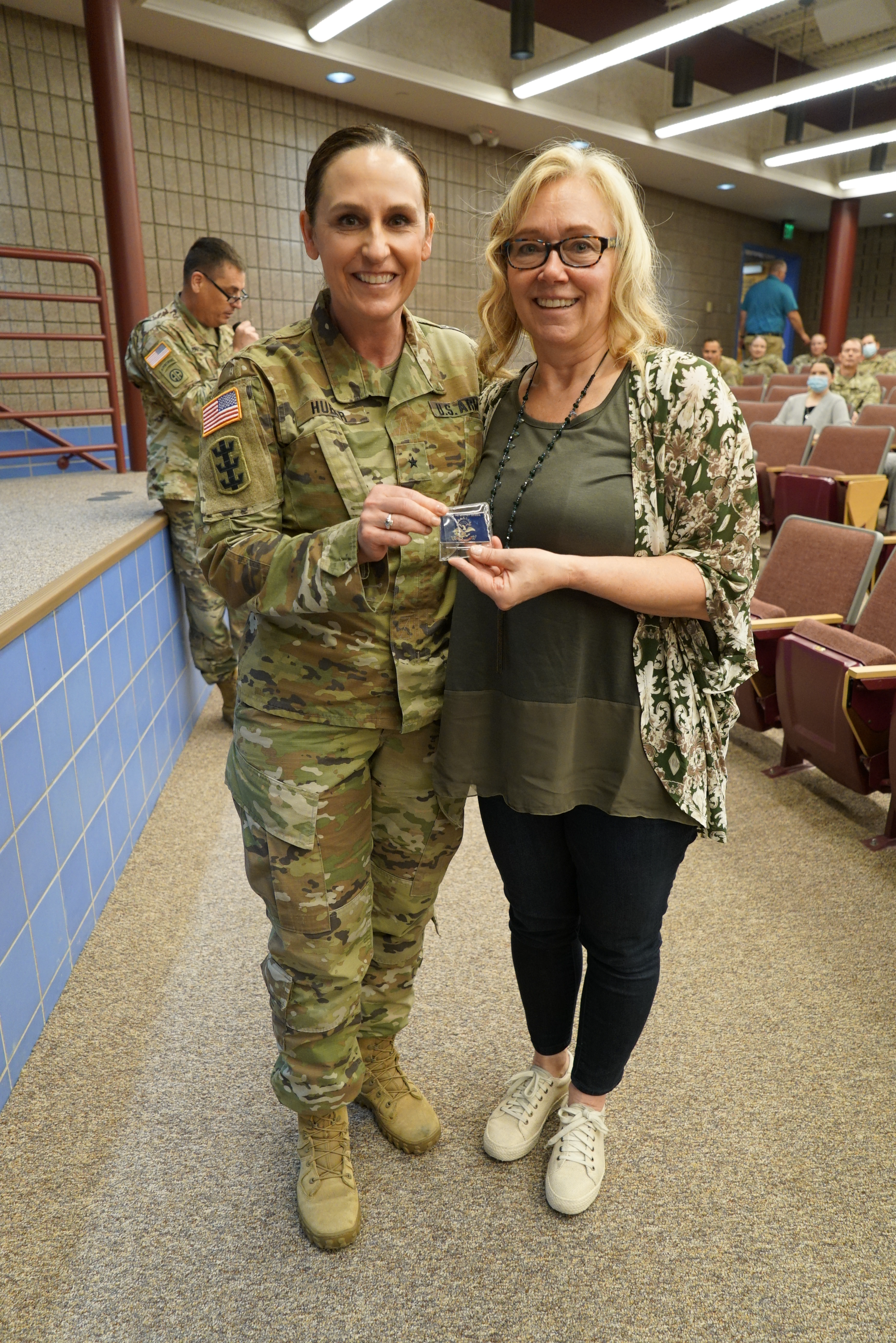 After this month's professional development, Brig. Gen. Jackie Huber, N.D. deputy adjutant general, recognized Janette Fetch for outstanding achievement at Raymond J. Bohn armory, June 9, 2021. (National Guard story and photos by Sgt. 1st Class Charles Highland, N.D. National Guard Public Affairs Office)