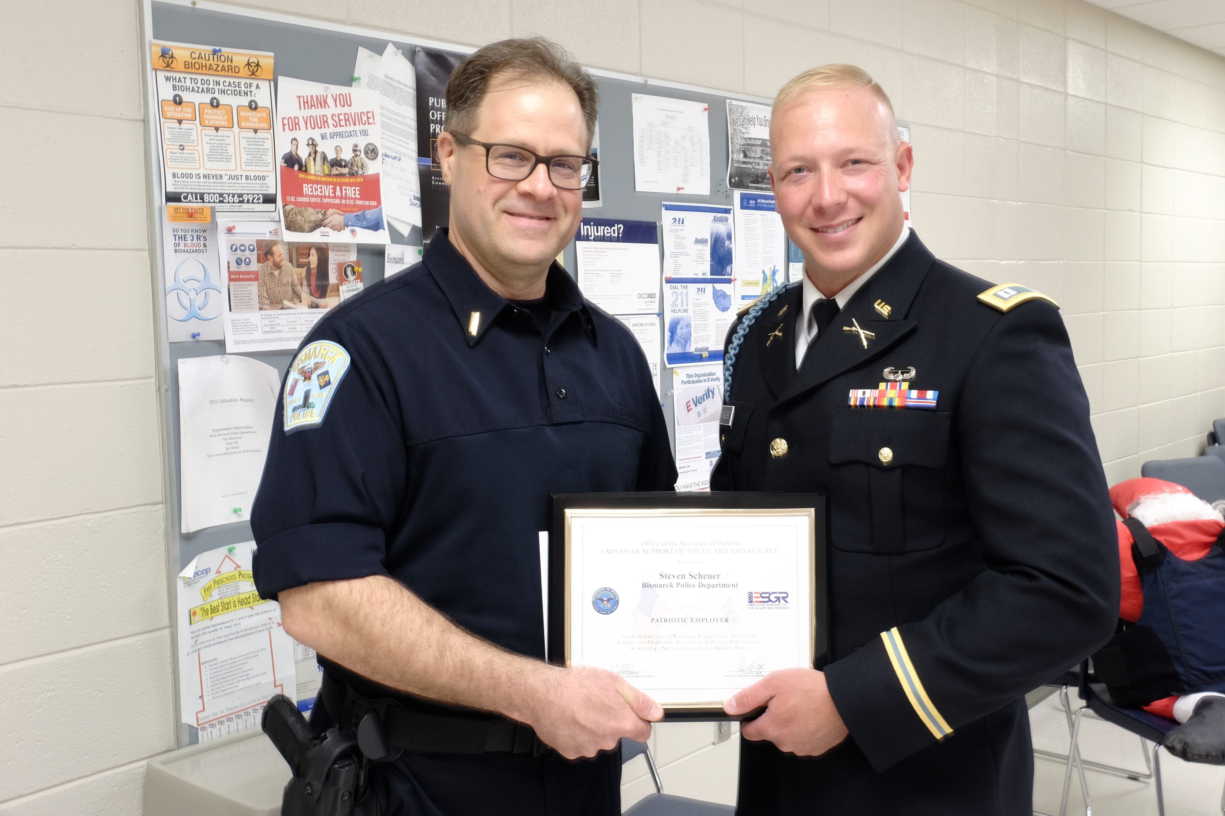 Capt. Bradley Miller awarded Lt. Steven Scheuer, shift commander Bismarck Police Department, the ESGR (Employer Support of the Guard and Reserve) Service Member Patriot Award, Bismarck, N.D., June 8, 2021. The award is a thank you from Miller to his supervisor in recognition of his support of his military service during his participation in the Guard's COVID-19 mission. For more information about ESGR outreach programs or volunteer opportunities, call (701) 333-2057 or visit ESGR.mil/ND.