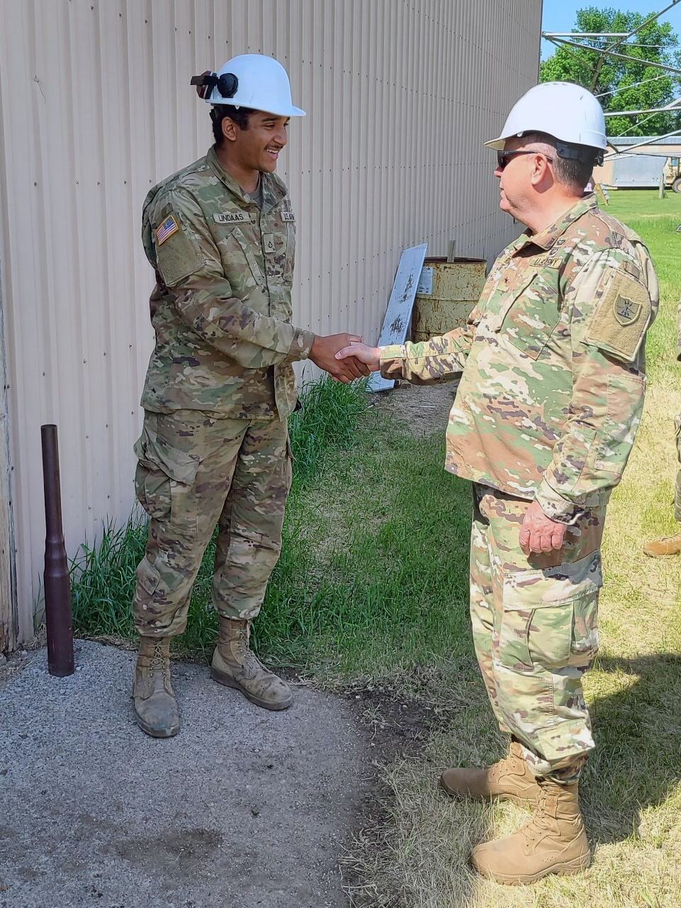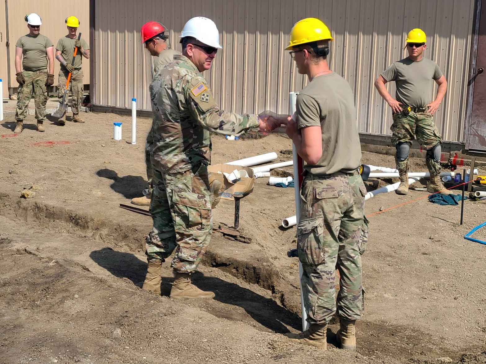 Brig. Gen. Leo Ryan, N.D. Army Component commander, and Col. Rob Fugere, G-3 operations officer, visited the Soldiers working on the civil-military assistance project on June 9, 2021. The 815th Engineer Company, based in Lisbon, Wishek and Edgeley, is tackling the project in two phases. About 60 Soldiers are working on the project from June 4 to June 17, 2021. For the second phase, June 18 to July 2, 2021, about 50 Soldiers will fall in on the project. The unit capabilities consists of both horizontal (earth moving equipment) and vertical (carpenters, plumbers, masons and electricians) construction capabilities.