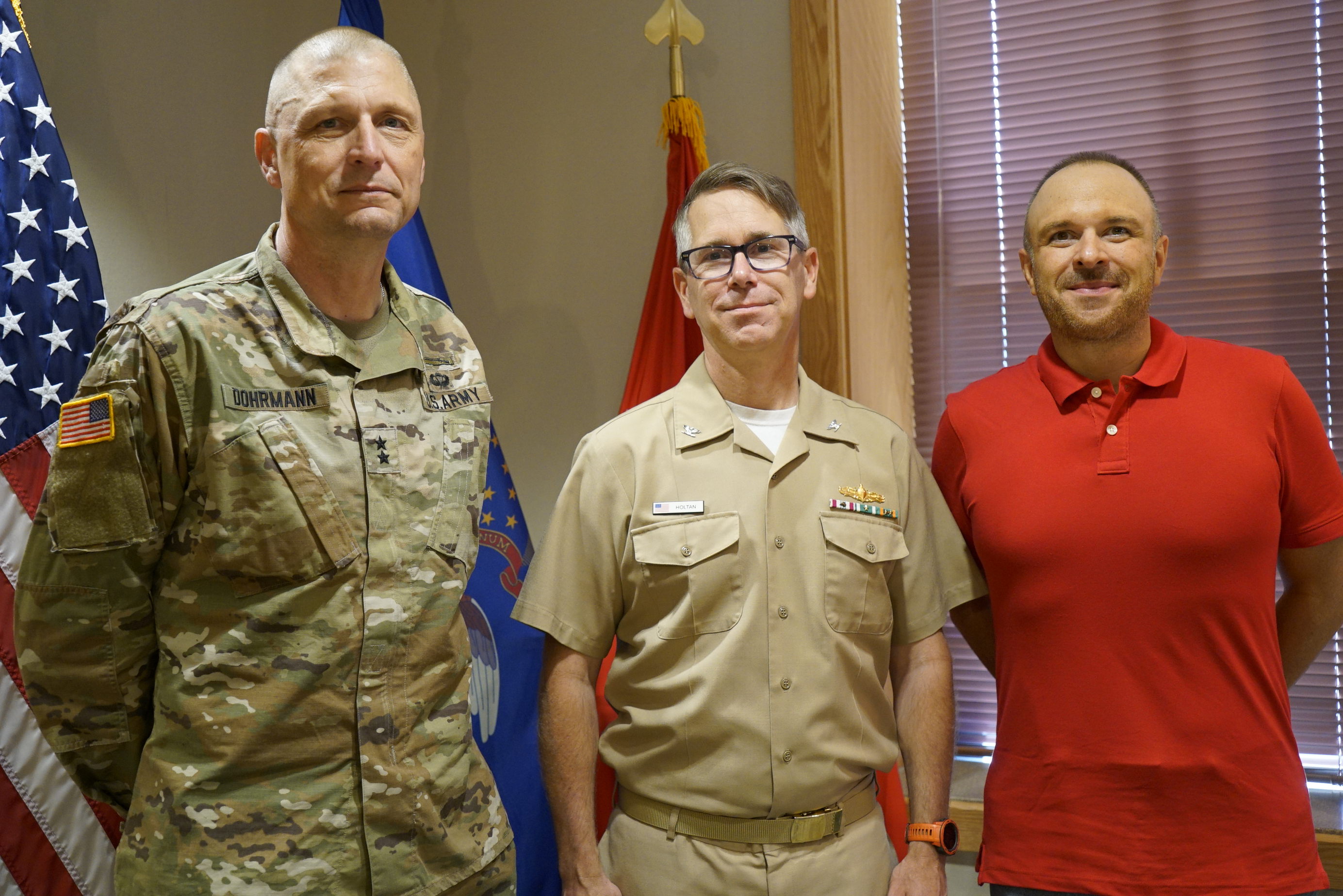 Capt. Douglas Holtan, the U.S. Navy's Emergency Liaison Preparedness Officer (EPLO) to North Dakota, conducted an office call with Maj. Gen. Al Dohrmann, N.D. adjutant general, and Cody Schulz, N.D. director of homeland defense, N.D. Department of Emergency Services, June 4, 2021. Holtan is a U.S. Navy Reserve Officer. (National Guard story and photo by Sgt. 1st Class Charles Highland, N.D. National Guard Public Affairs)