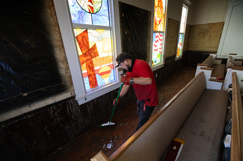 Arriba: Elías Torres limpia los daños causados por las inundaciones del huracán Helene en la Iglesia Metodista Unida Cedar Key, Florida.