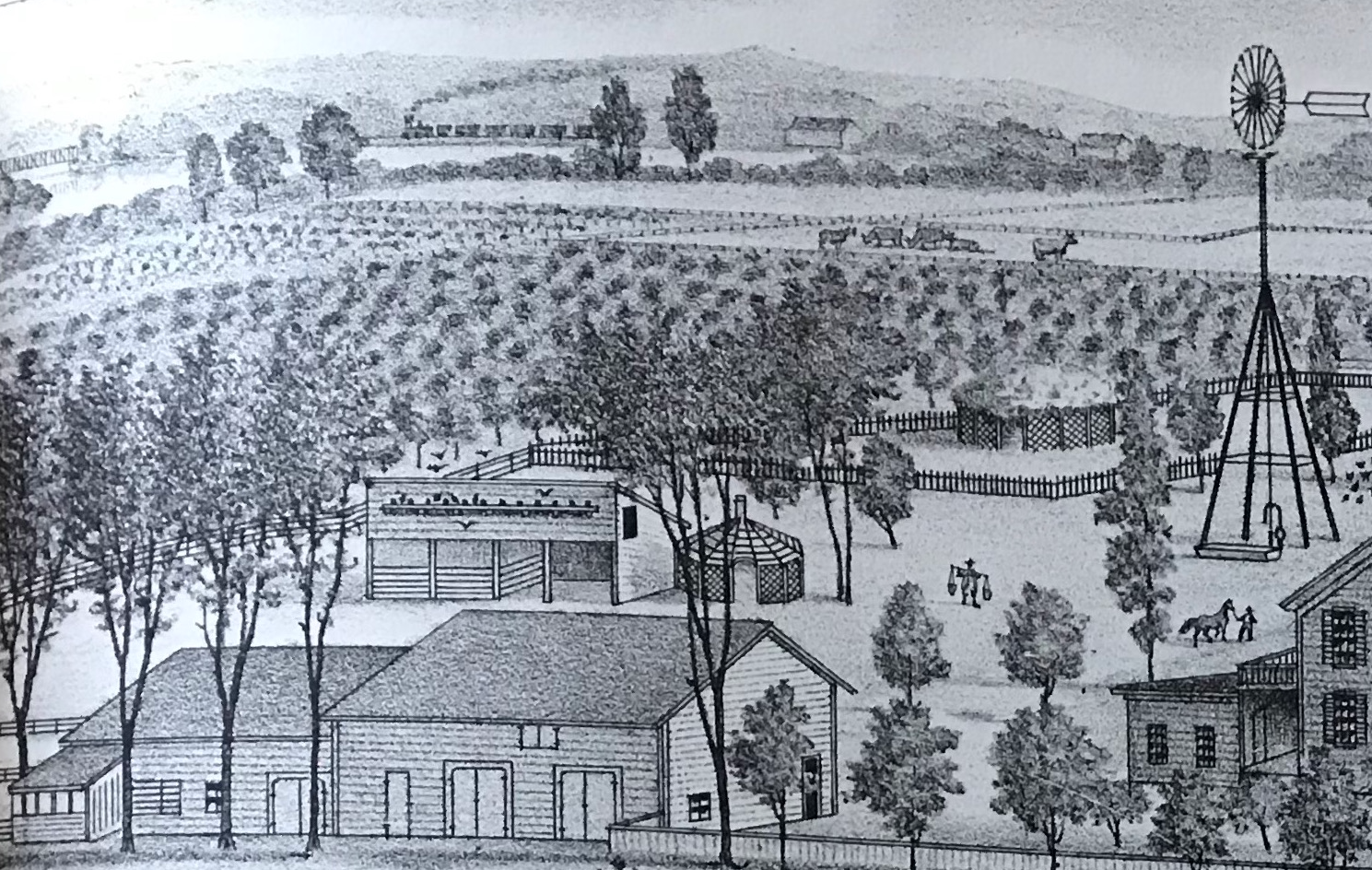 Imagen de fondo: "Vista aérea de los jardines frutales de James Holland, 100 acres, en Lile's Bridge;” Historia del condado de Sacramento, California; Thompson y West, 1880.