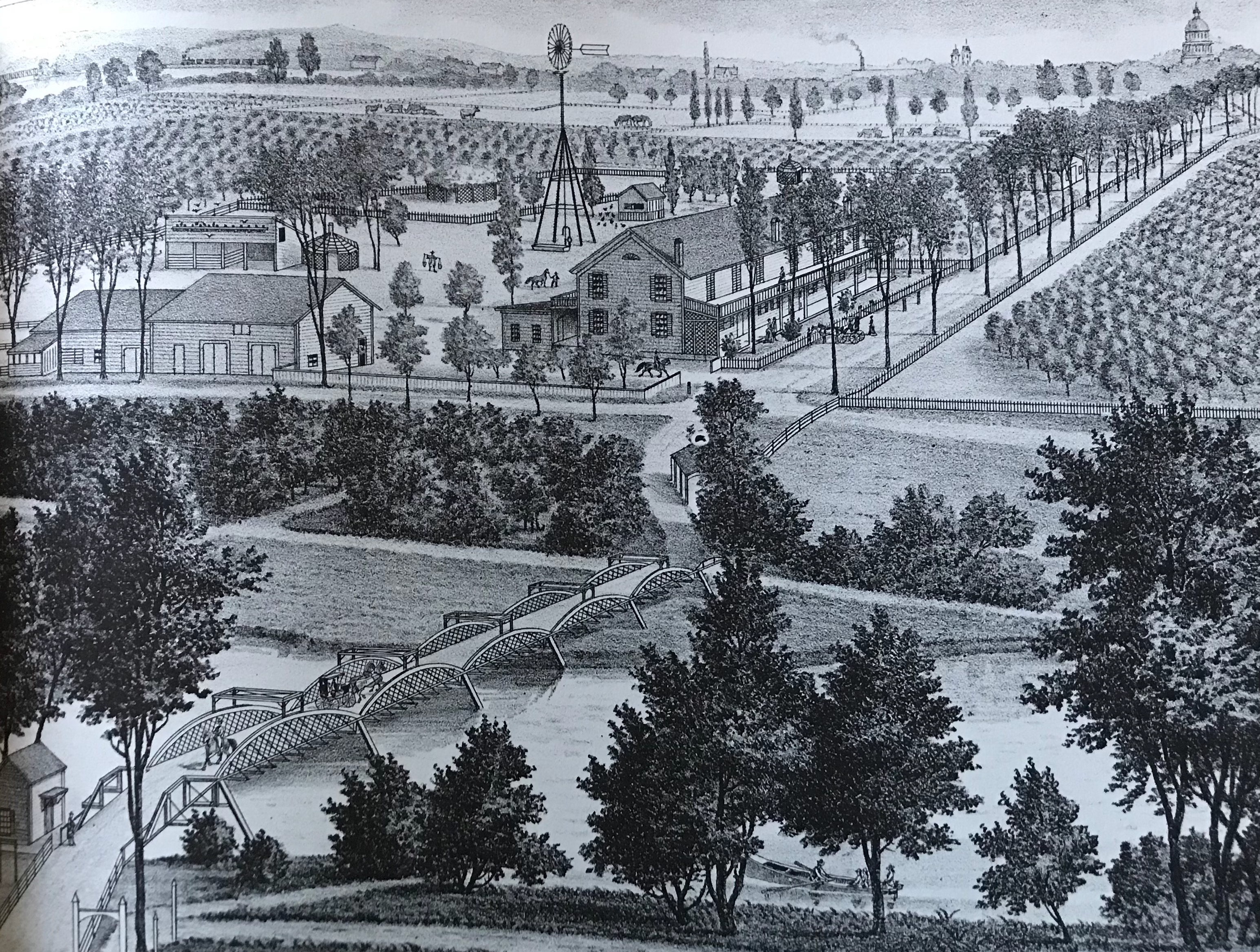 Las primeras imágenes del río Americano son raras. Una excepción aparece en la Historia del condado de Sacramento de 1880 de Thompson y West. Esta vista de la granja de 100 acres de James Holland incluye el Puente de Lisle, que atraía a viajeros del norte y del este.