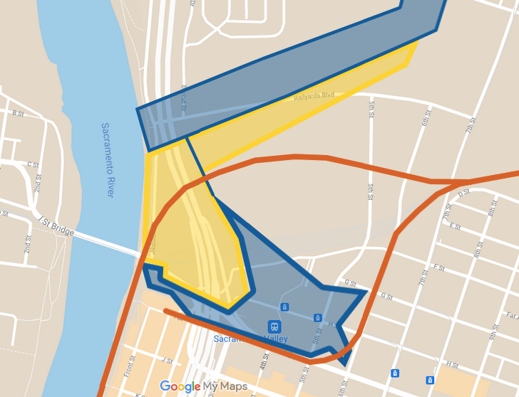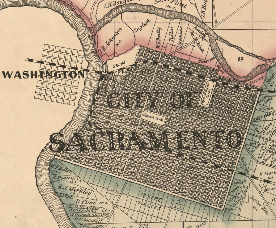 En 1885 la ciudad se había reducido. La nueva frontera norte se encontraba justo más allá de las vías del ferrocarril. El río Americano ahora estaba separado de la ciudad. Sacramento no recuperaría todo su frente marítimo hasta 1963.