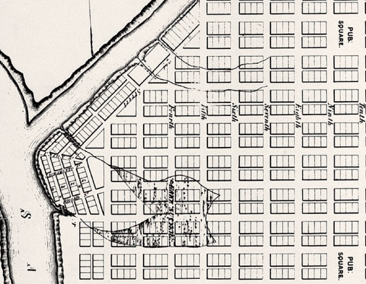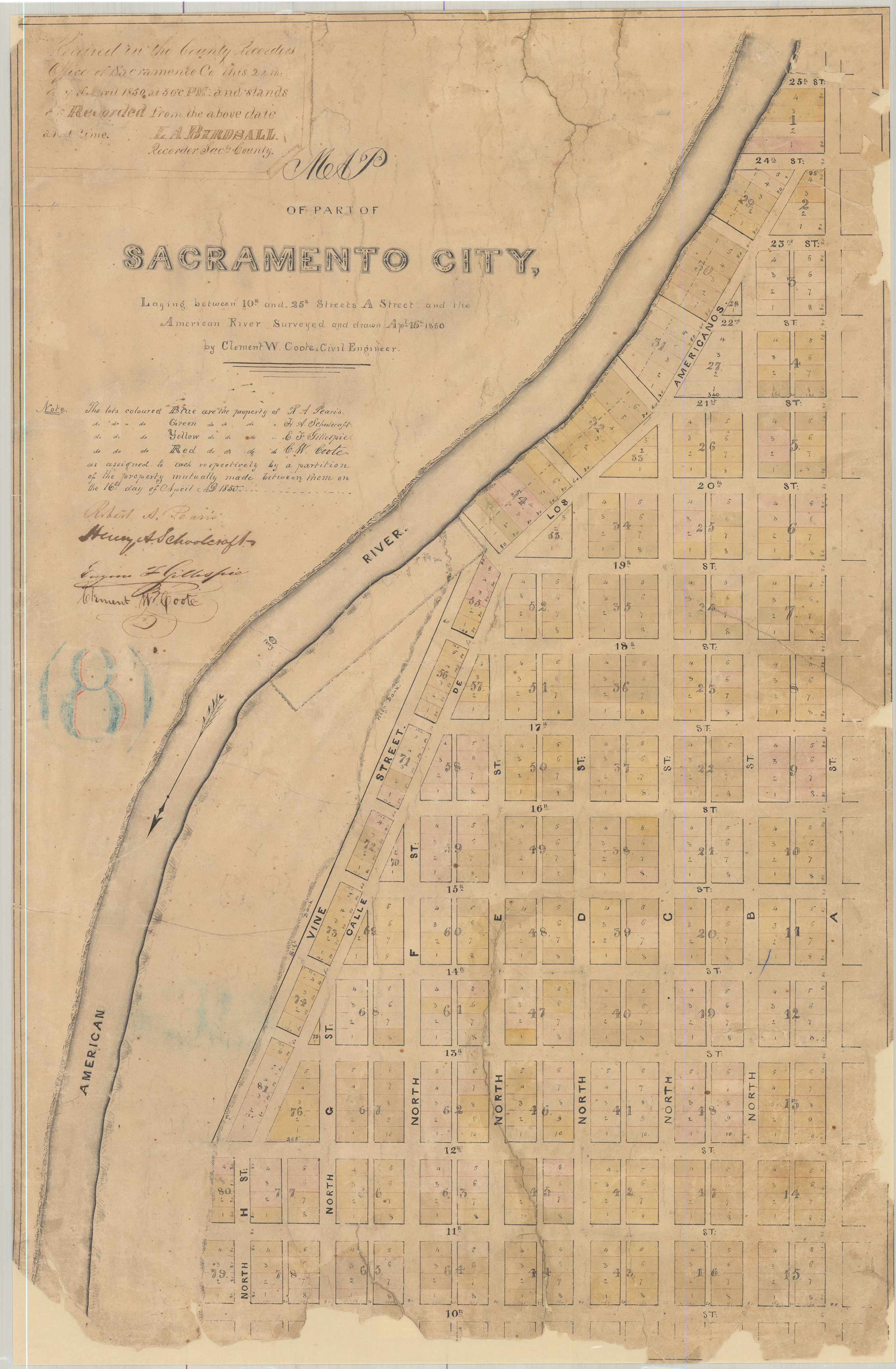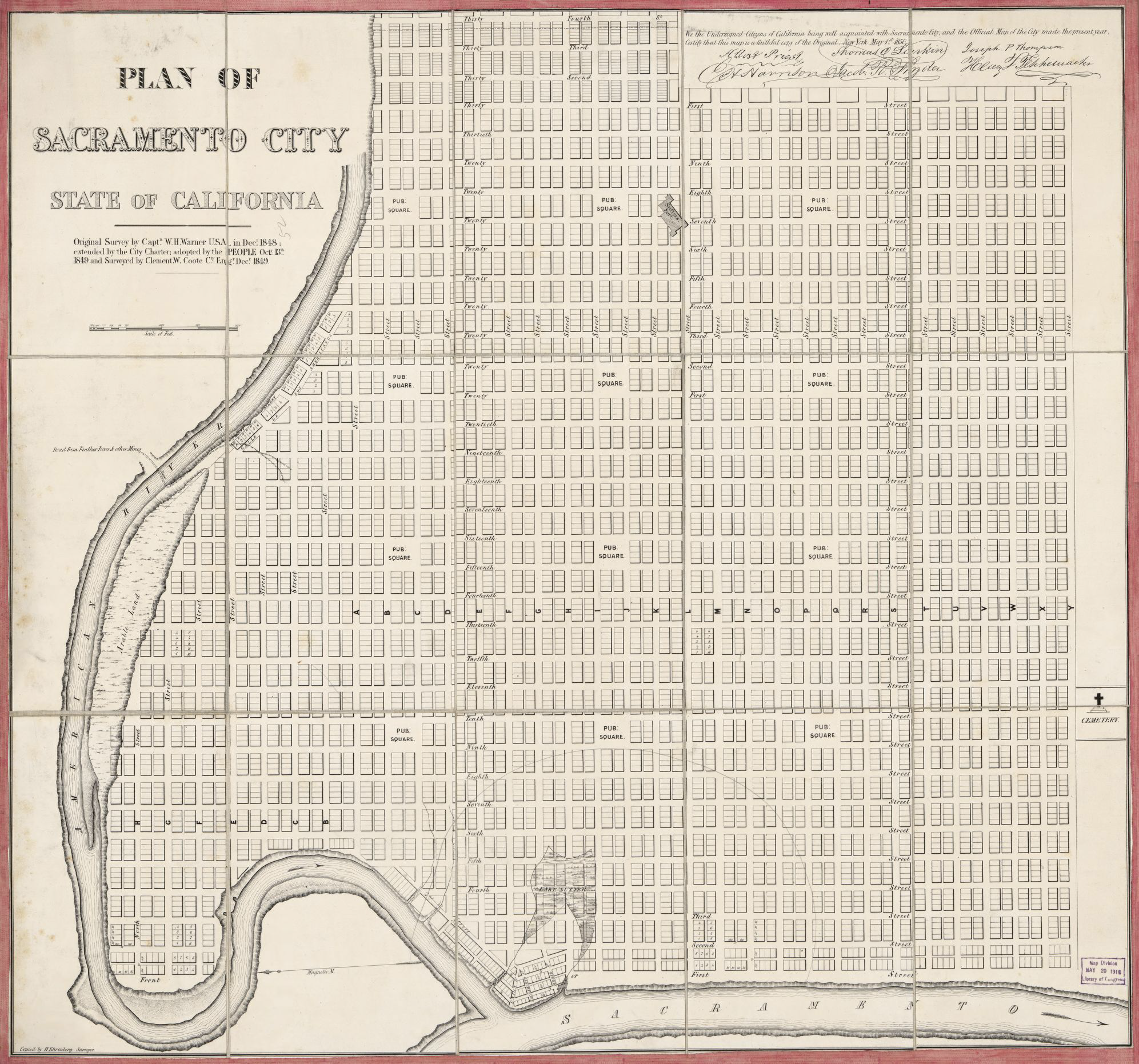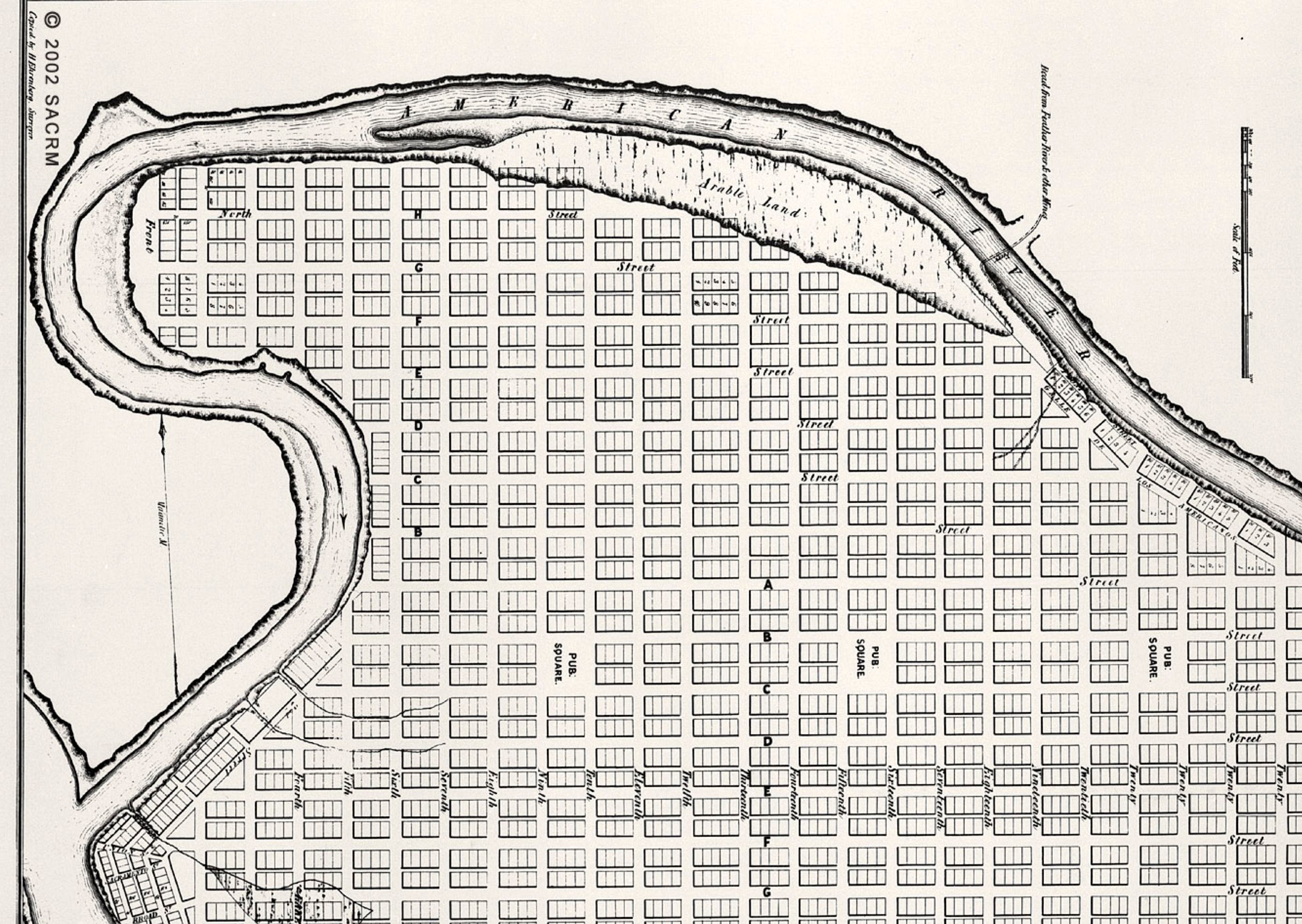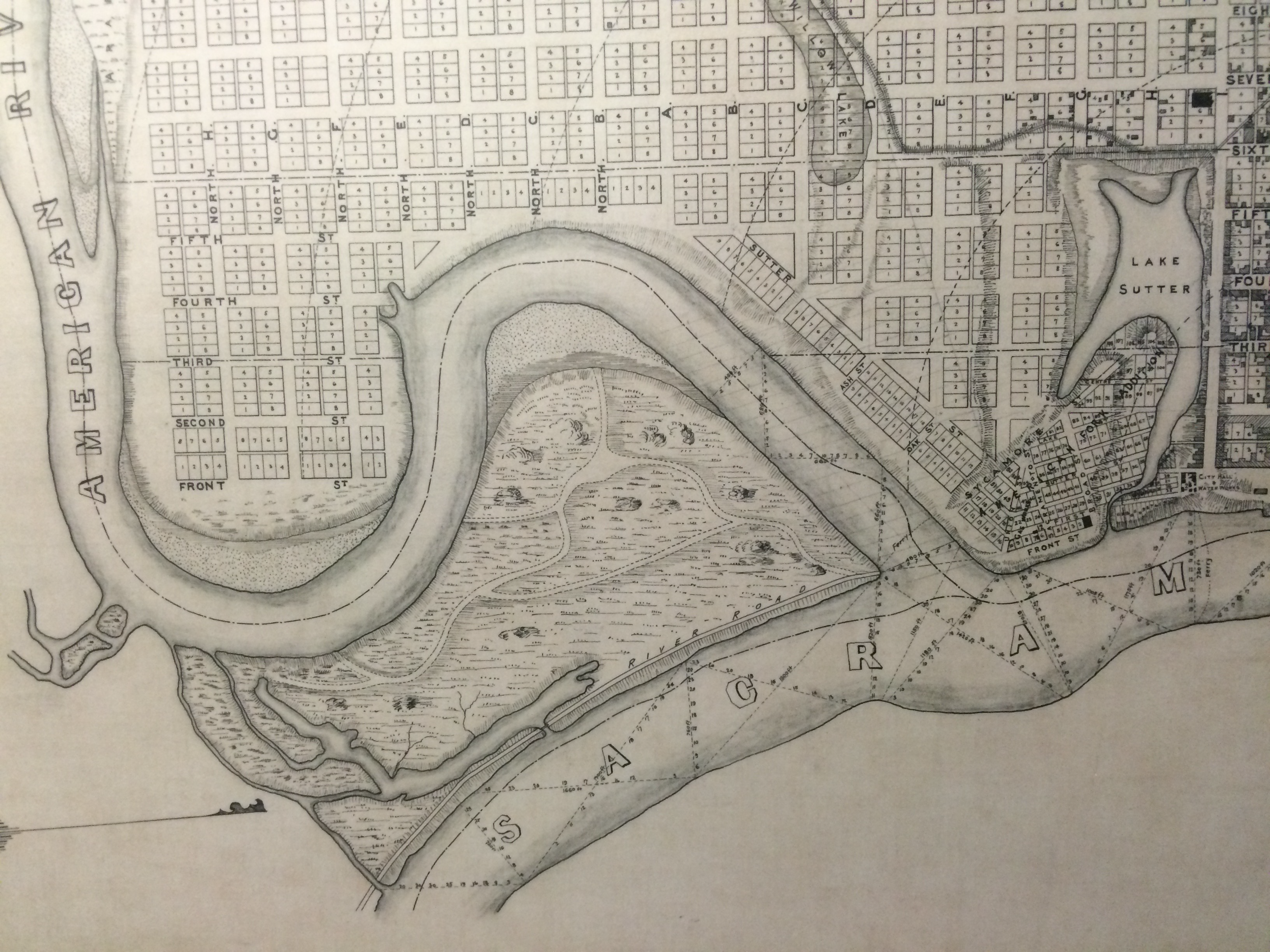 Los mapas más antiguos de la ciudad de Sacramento también revelan un paseo marítimo más antiguo en Lisle's Bridge. Poco se sabe sobre la Calle de los Americanos. El nombre sugiere que fue el hogar de los estadounidenses durante el período mexicano. En cualquier caso, esta calle estaba aquí cuando se estudió por primera vez la ciudad de Sacramento. Otro mapa muestra que era valioso. En 1850, el topógrafo de la ciudad Clement Coote, el destacado comerciante de tierras Henry Schoolcraft y otros dividieron las parcelas. Cada uno vio valor en esta propiedad inmobiliaria en la puerta de entrada a Sacramento. Cada uno quería proteger su inversión.