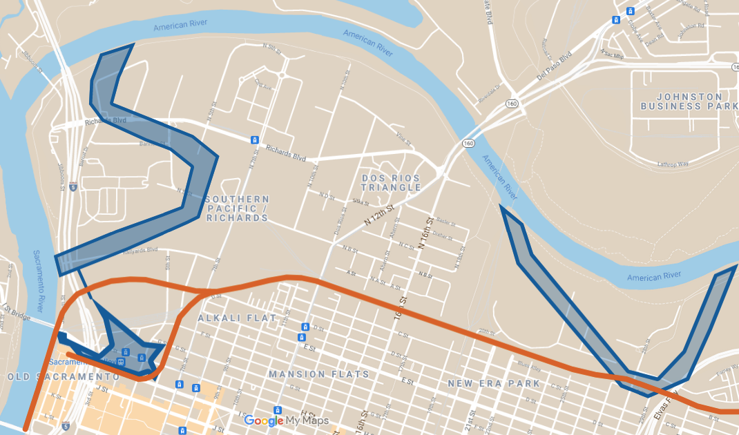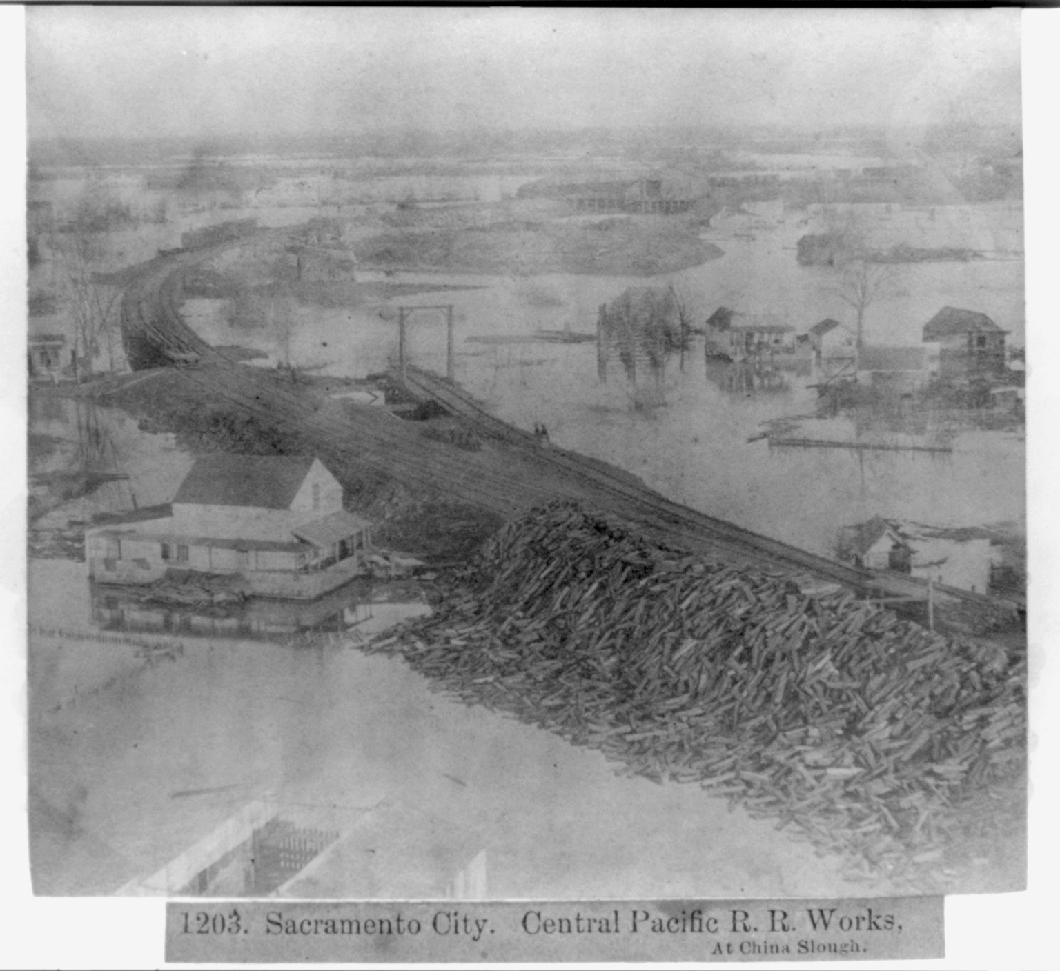 La mayor parte de la ciudad de Sacramento se encontraba en una cuenca de inundación. El agua amenazaba por todos lados. “The Slough,” también conocido como China Slough o Sutter Lake, a menudo inundaba la ciudad. Este era el remanente de un antiguo canal de río, y volvería a la vida durante las inundaciones, incluso después de que el estadounidense fuera trasladado. Cuando el río se desbordara al norte de la ciudad, la inundación pasaría a través de una red de canales más pequeños. Luego pasaría por Slough y desembocaría en el río Sacramento. El Slough se rellenó gradualmente para crear el borde sur de Union Pacific Railyards. Ahora incluye el sitio de la estación Sacramento Valley, el moderno centro de transporte de la ciudad.