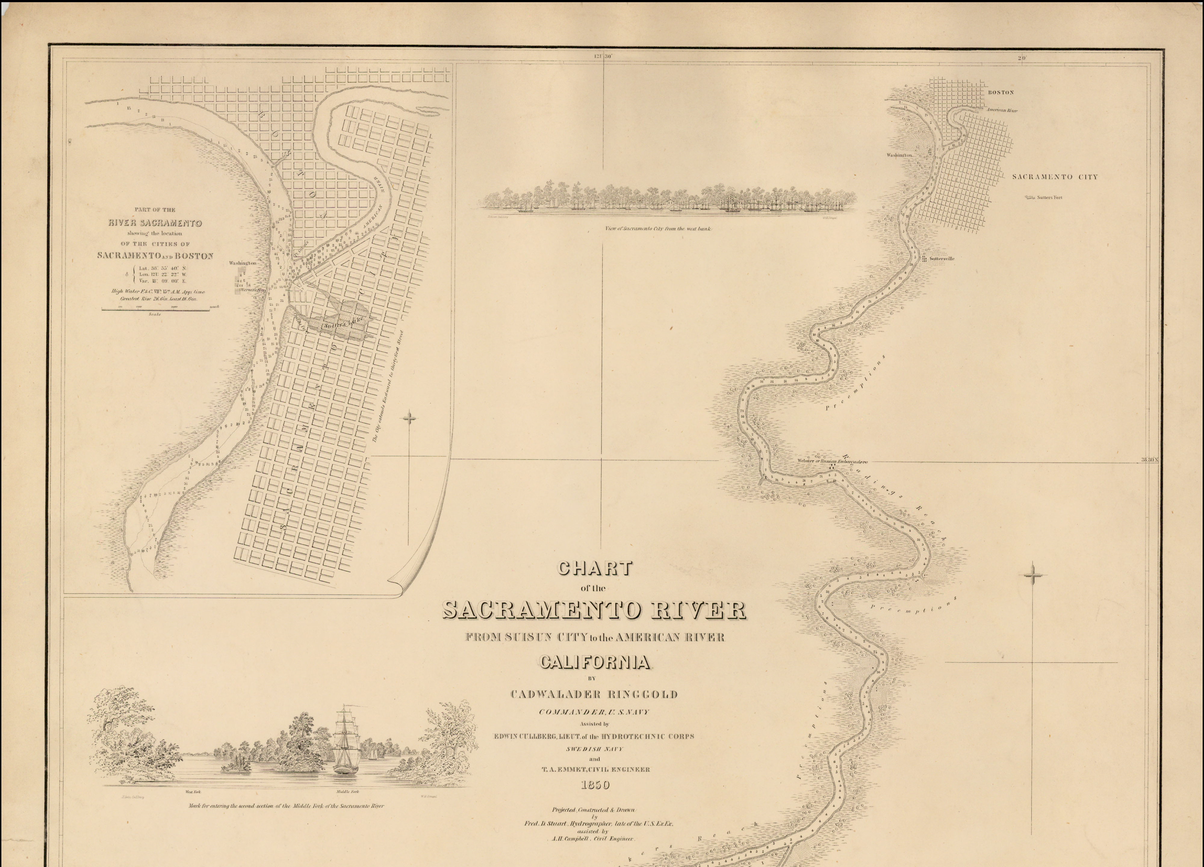 La ciudad de Sacramento no estaba sola en la desembocadura del río Americano. Un rival llamado Boston estaba ubicado justo al norte del antiguo canal. Este mapa es de Cadwalader Ringgold, quien también inspeccionó Boston. Muestra una ordenada cuadrícula de bloques, que eran visiblemente más pequeños que los de la ciudad de Sacramento y estaban inclinados 10 grados hacia el noroeste. En 1850, E. Gould Buffum describió el diseño de Boston, incluido el tamaño de los bloques. Estos bloques corroboran un mapa anterior que muestra a Boston junto a la ciudad de Sacramento y son la base para una reconstrucción que revela los límites de las parcelas de Boston que se extienden hasta Discovery Park.