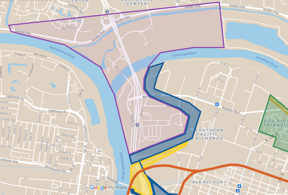 La mayoría de las ciudades se expanden hacia afuera. Pero la ciudad de Sacramento nació enorme: más de 1,000 cuadras de la ciudad. Se trataba de un plan de tierras audaz, que aprovechó la manía del oro para vender tierras pobres a recién llegados ingenuos. Después de cinco años, los edificios ocupaban sólo una pequeña porción de la extensa extensión. Aún así, el sistema de distritos de la ciudad de Sacramento se extendió a los rincones más lejanos de esta vasta red. Los tres barrios llegaron al río Americano.
