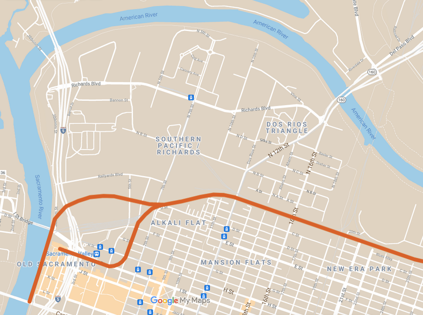 La construcción del ferrocarril dividió a Older Sac. El núcleo original de la ciudad quedó fragmentado, aislado y propenso a inundaciones.
