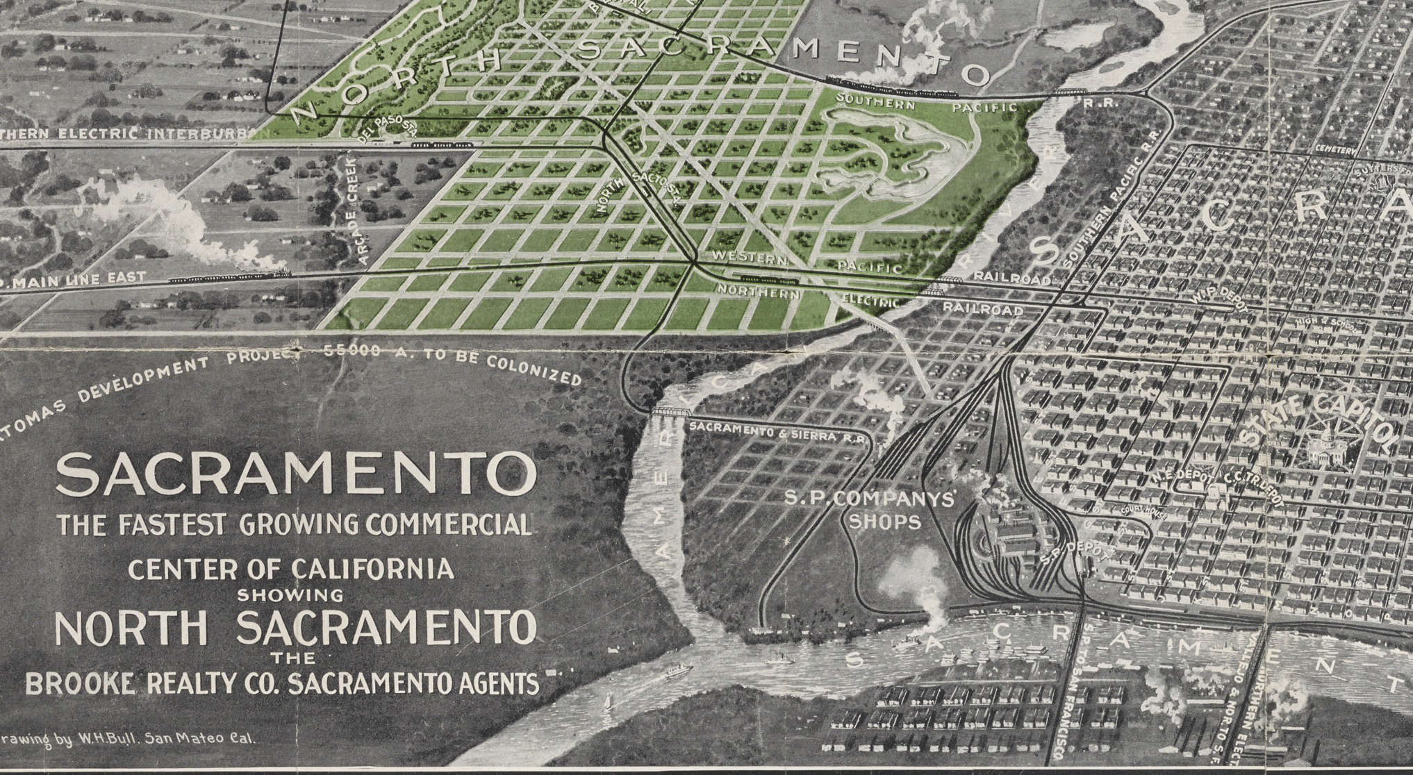 En 1911, Phinney, Cate & Marshall publicaron un mapa del condado de Sacramento. Incluía algunas características que no eran reales. Por ejemplo, mostraron un cruce de ferrocarril en la calle 10; El ferrocarril Sacramento & Sierra fue una empresa fallida para transportar madera al río Sacramento. Su cabecera planificada se encontraba justo al norte de las tiendas SPRR. Este puente también apareció en un folleto de 1911 que promocionaba la venta de terrenos en el norte de Sacramento. Incluso la idea de un ferrocarril ayudó a vender terrenos.