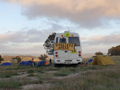 The climb leads through spectacular granite boulder country to the main Lancefield - Pyalong Road. Coming from the other direction, it would be a wonderful, sweeping descent with extraordinary views. Instead, the one group who climbs it has to work hard for every metre they gain. A final few kilometres leads to a school property at Nulla Vale, where no time is wasted putting up tents, feasting on snacks (including a special delivery of hot chips), and exploring our surrounds. Dinner is an absolute treat, courtesy of Marisa at Candlebark.