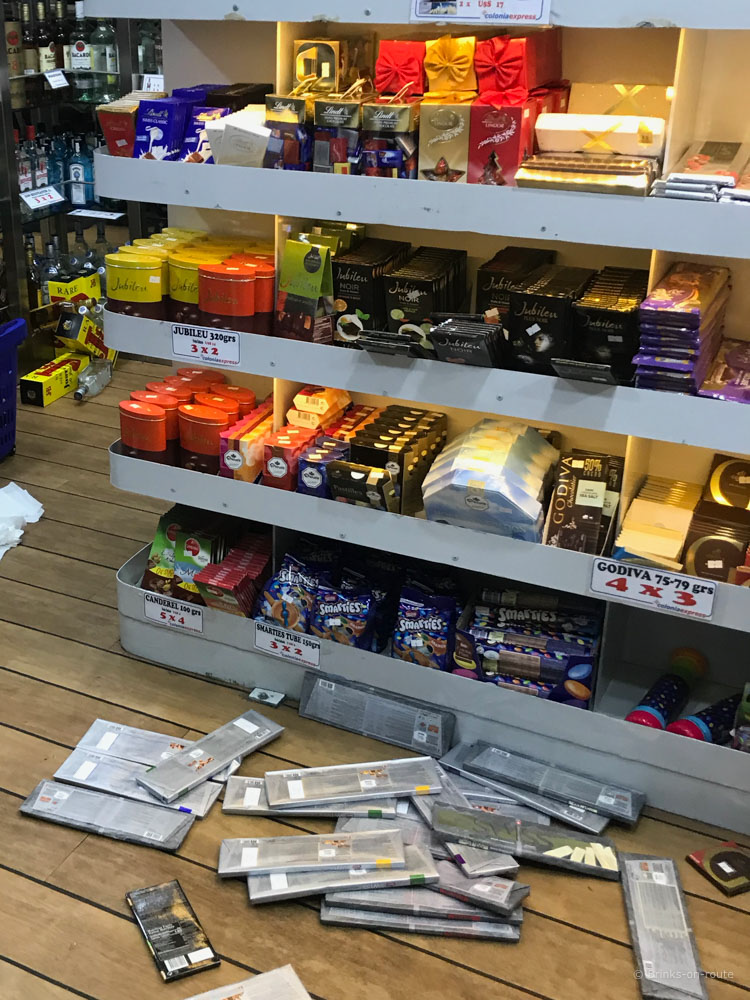 De ferry van Buenos Aires naar Colonia is behoorlijk choppy. Behalve dat vele mensen ziek zijn vliegen de chocolade repen door de winkel. Vanaf Colonia moeten we nog 180km met de bus