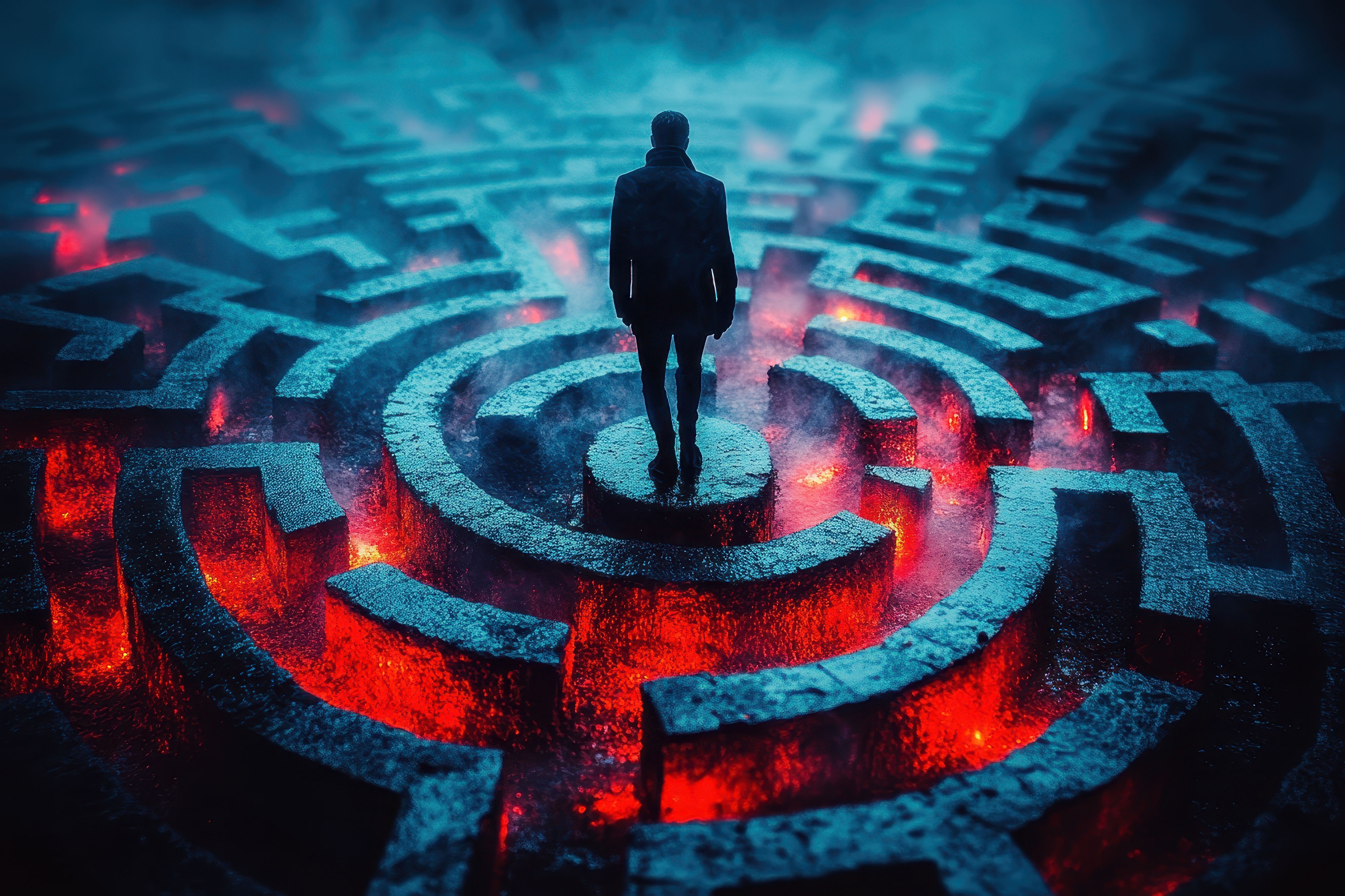 Creado con imágenes de Tanu - "Man stands in illuminated labyrinth surrounded by smoky atmosphere and fiery elements at night" • Ahmad - "A single door leading into nothingness, representing the uncertainty of future paths and the endless possibilities that exist within the unknown" • Reza - "Labyrinthine Library with Infinite Shelves and Dimensional Portals" • Sirichai - "Shattered: A dramatic black and white portrait of a woman with a cracked and weathered face, symbolizing vulnerability, pain, and the fragility of the human spirit."