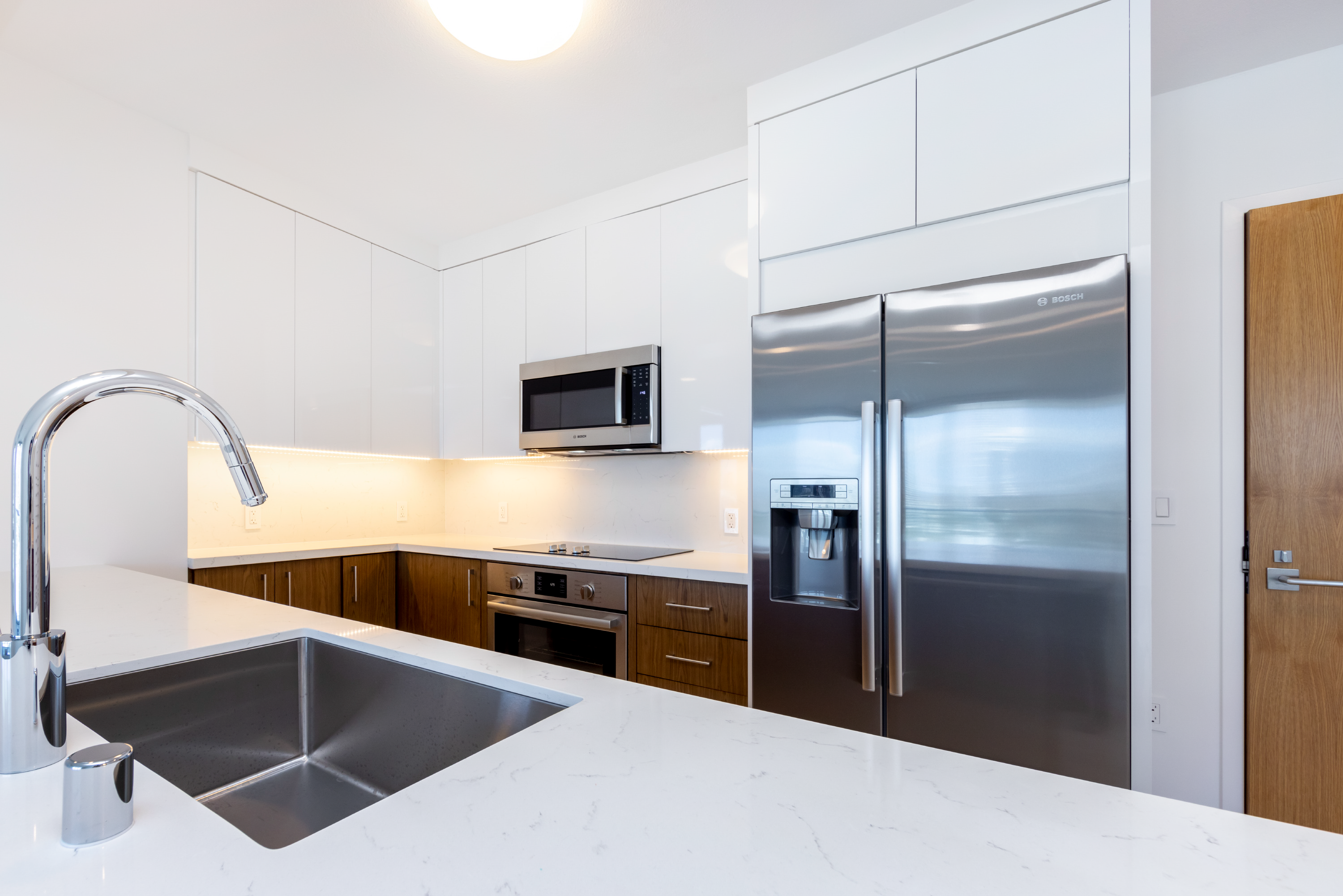 室内は、自然光たっぷりの2ベッドルーム、2バス、ボッシュ社製のアプライアンスを配置したデザイナーズ・キッチン、品の良い木目色と白色のツー・トーン・カラーでまとめられた使いやすいキャビネット、バー仕様のカウンター、スプリット式エアコン3台が室内全域をむらなくカバーし、ラナイと、二つのクローゼット、と二つの洗面台を備えたマスターベッドルームからは、紺碧のオーシャンヴューの眺望をご堪能いただけます。