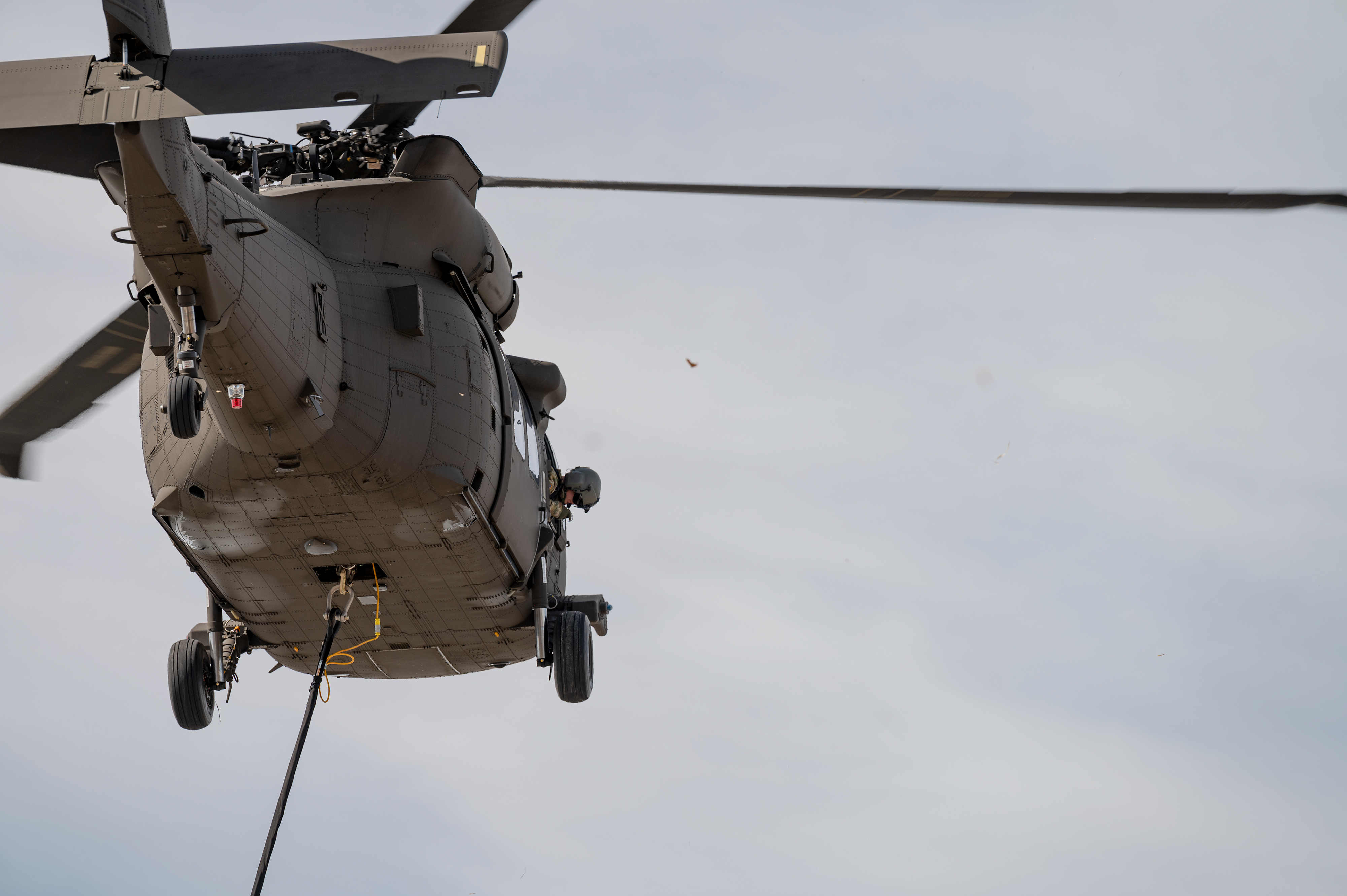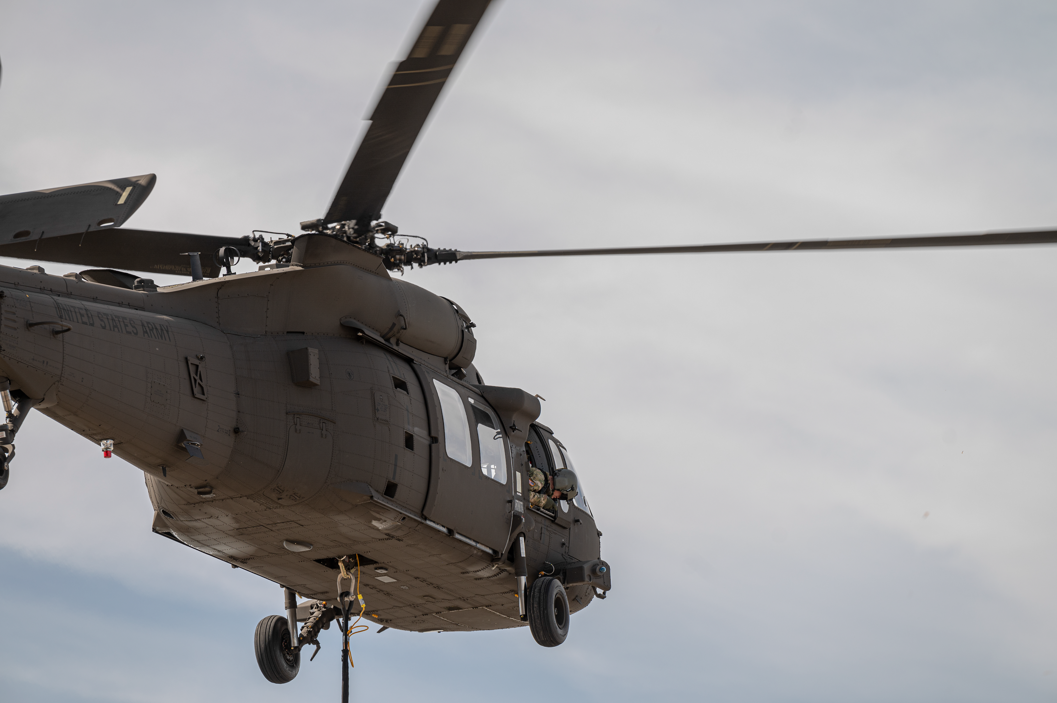 The UH-60 Black Hawk helicopter crew chief directs the pilots during one-ton sandbag hookup procedures during flood response training in Bismarck, April 12, 2023.