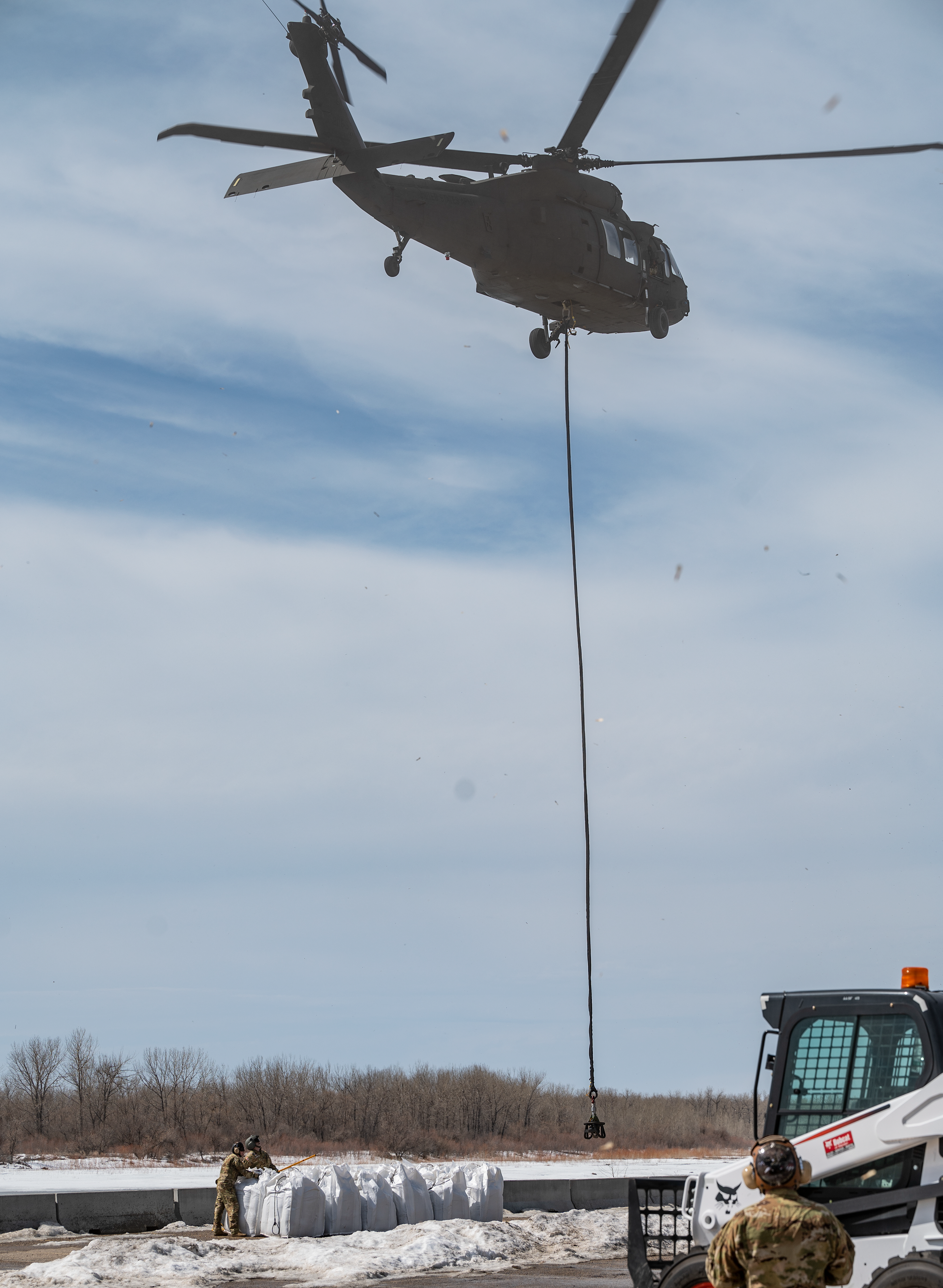 “Expanding our training to two sites was a win-win scenario,” said Maj. Gen. Al Dohrmann, N.D. National Guard adjutant general. “In addition to assisting one of our communities, simultaneous missions provided excellent training for our operations personnel in commanding and controlling aircraft in multiple locations. We also gained experience working with community members who filled, staged and guided these large sandbags into position.”