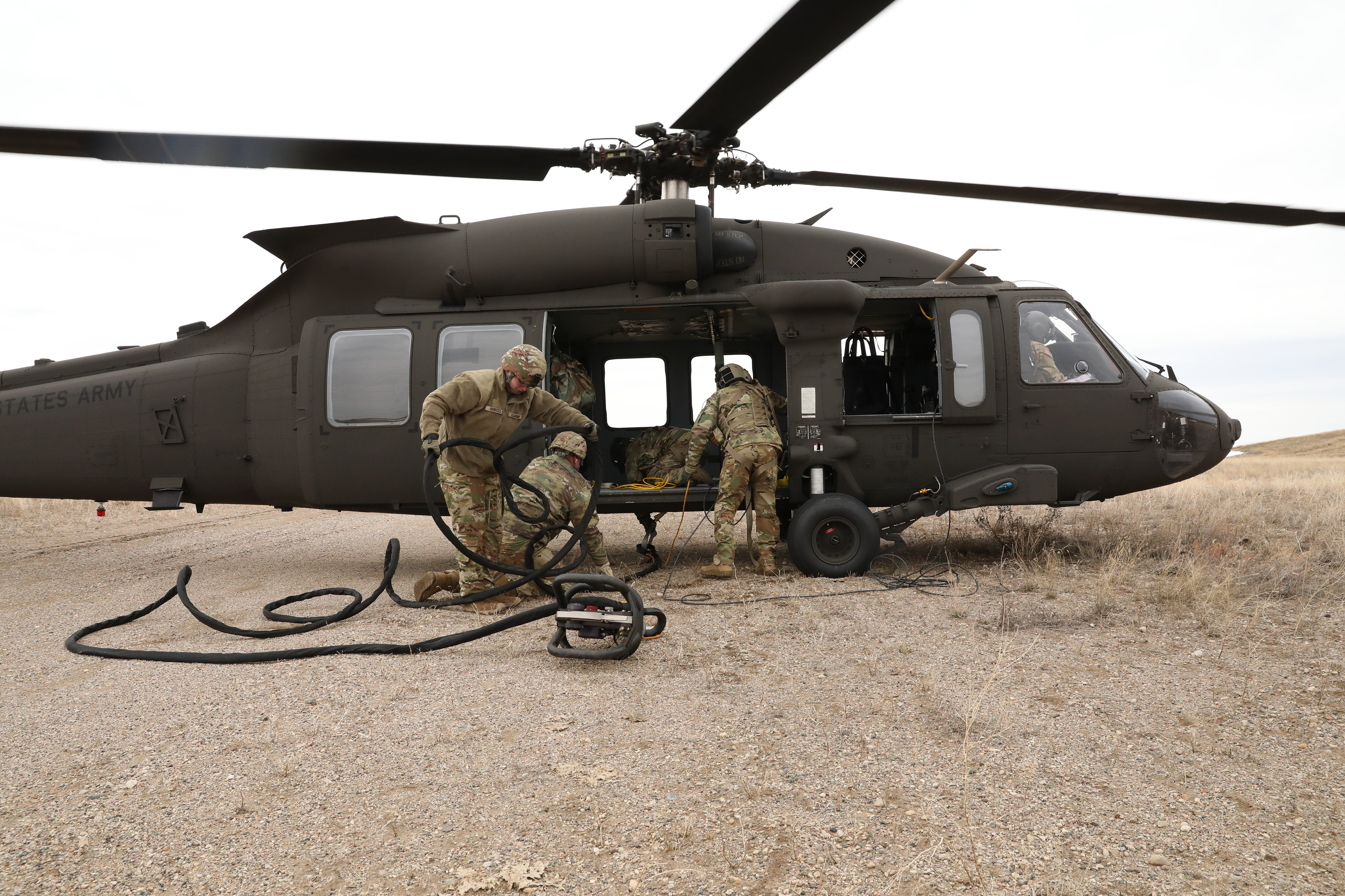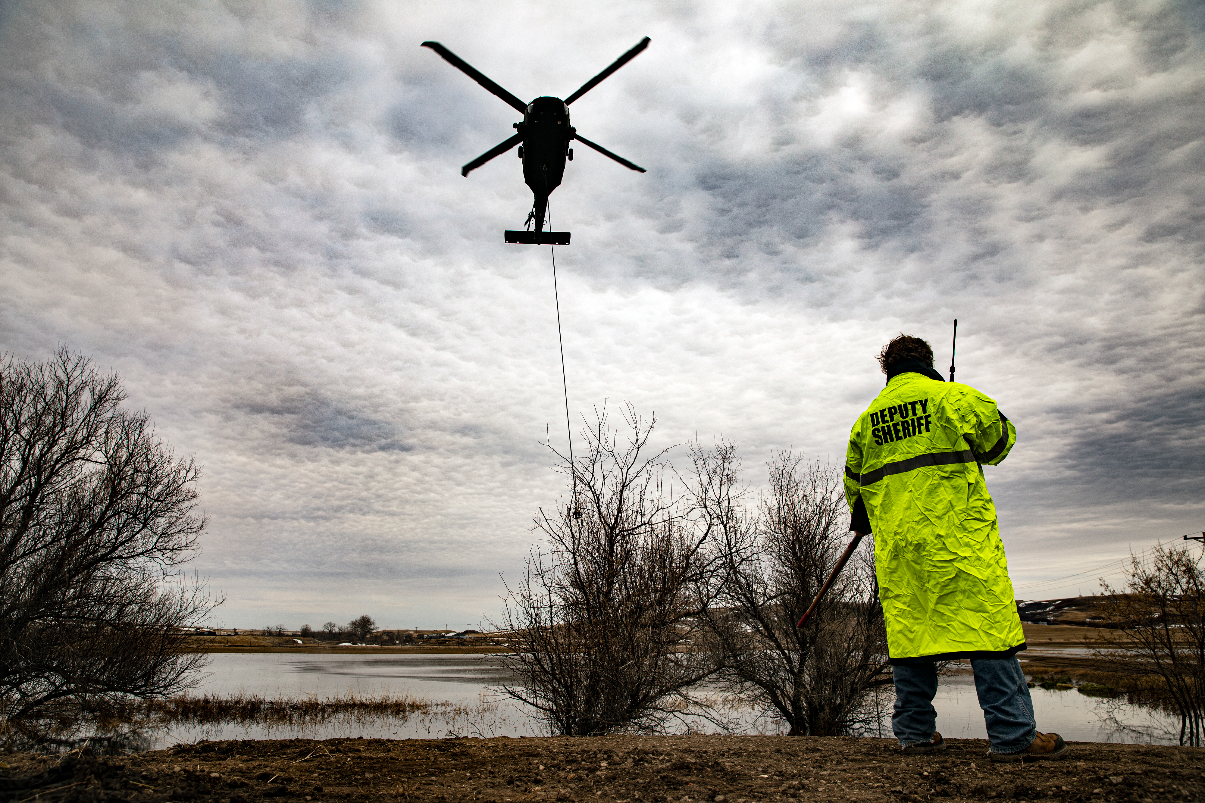 The response, at the request of the Mountrail County emergency manager, resulted in the Black Hawk crews placing seven large sandbags to help block water flow from an interior drainage culvert. This effort helped prevent further water inundation of the town. This request for assistance was an opportunity to practice the same training tasks that were scheduled at Kimball Bottoms, south of Bismarck.