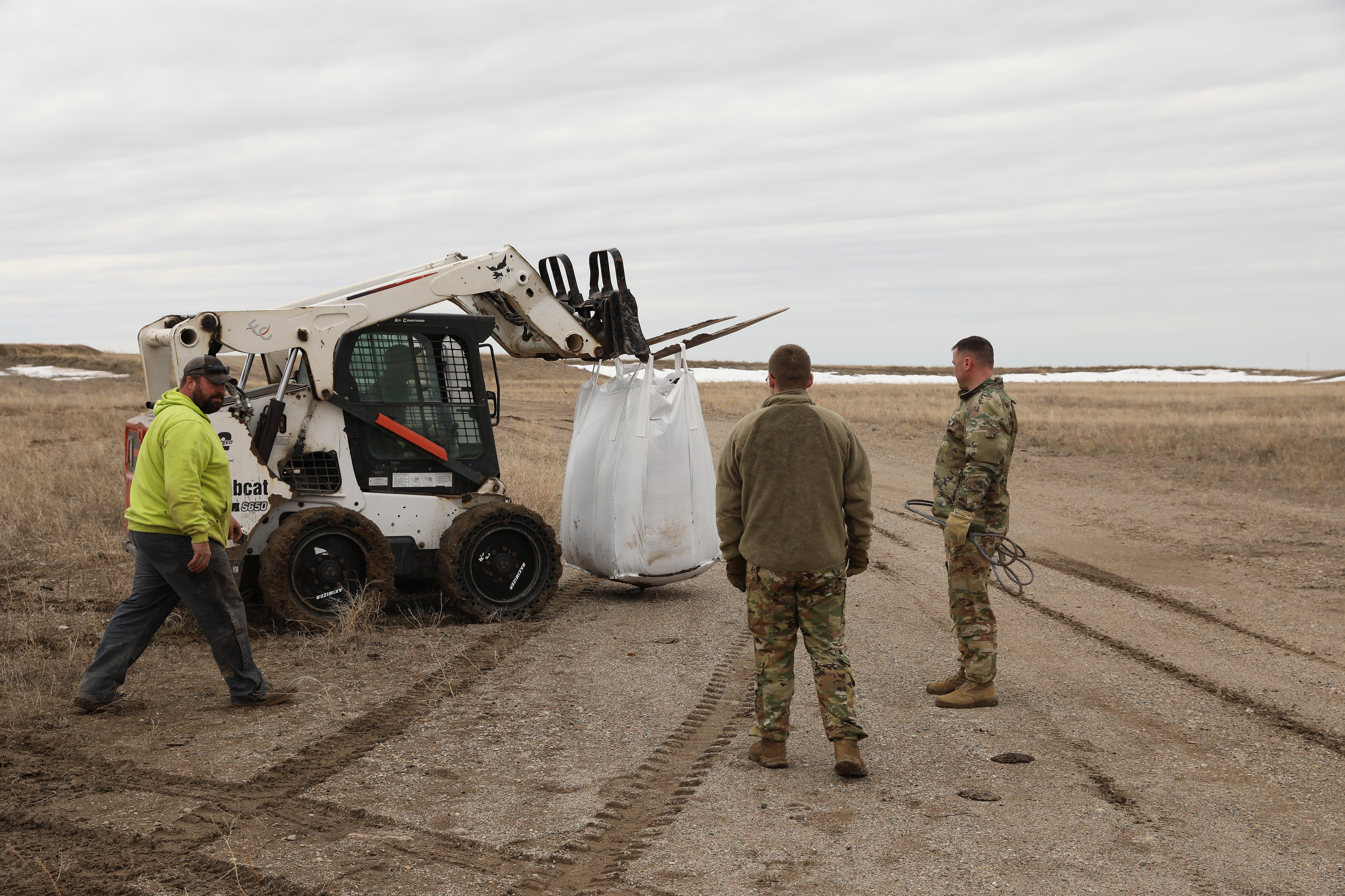 Pfc. Joseph Seibold, Company C, 2nd Battalion, 285th Aviation Regiment, watches a loader fill a one-ton sandbag for use during flood response, April 12, 2023, White Earth, N.D.