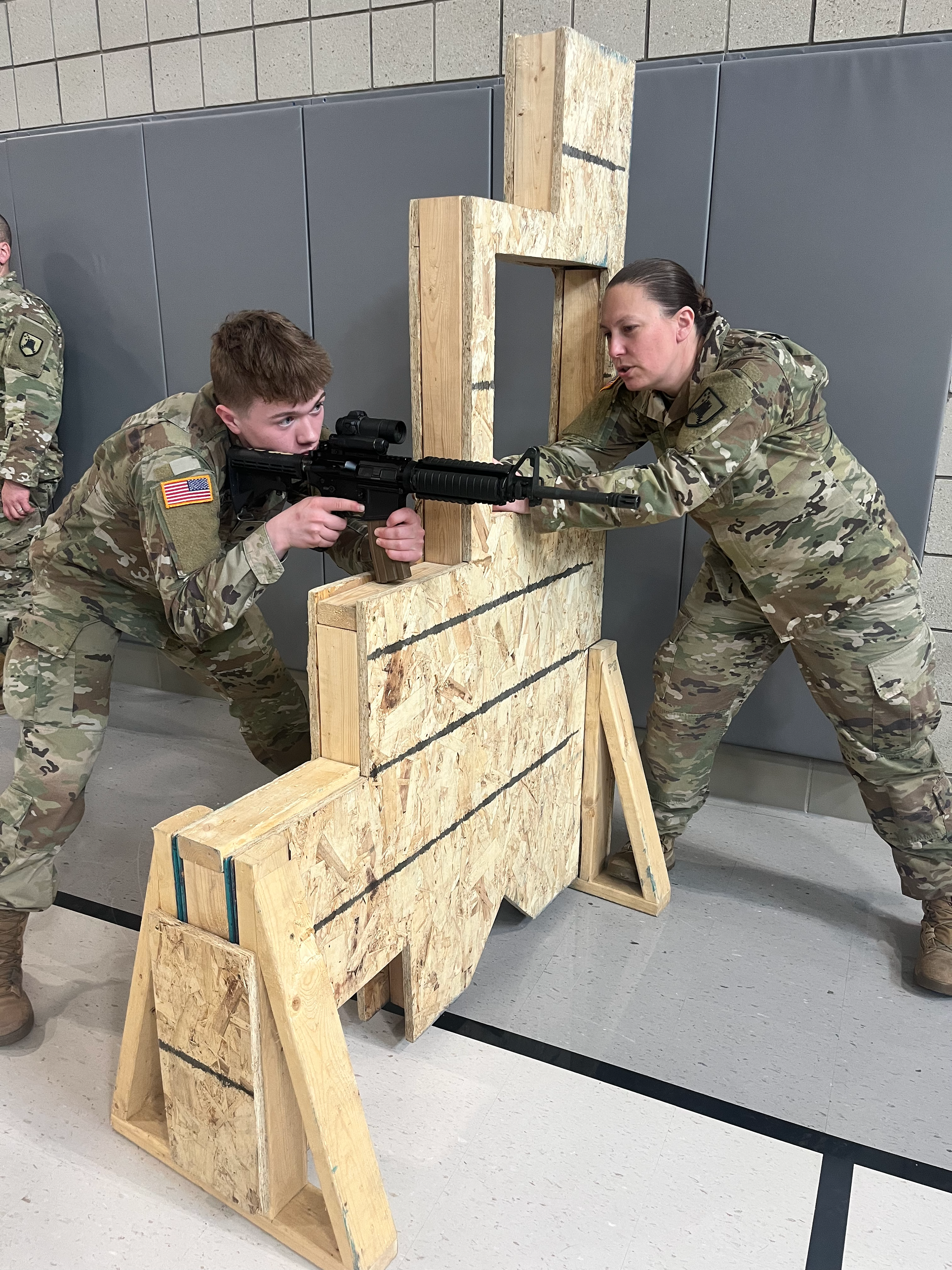 Sgt. 1st Class Amy Sleath, Operations Chemical, Biological, Radiologoical, and Nuclear (CBRN), non-commissioned officer, 141 Maneuver Enhancement Brigade (MEB) assists Cadet Christian Marshall while he practices his stance for individual weapons qualification, April 14, 2023, Fargo, N.D. (Photo by Sgt. 1st Class Ashley Johlfs, 141st MEB)