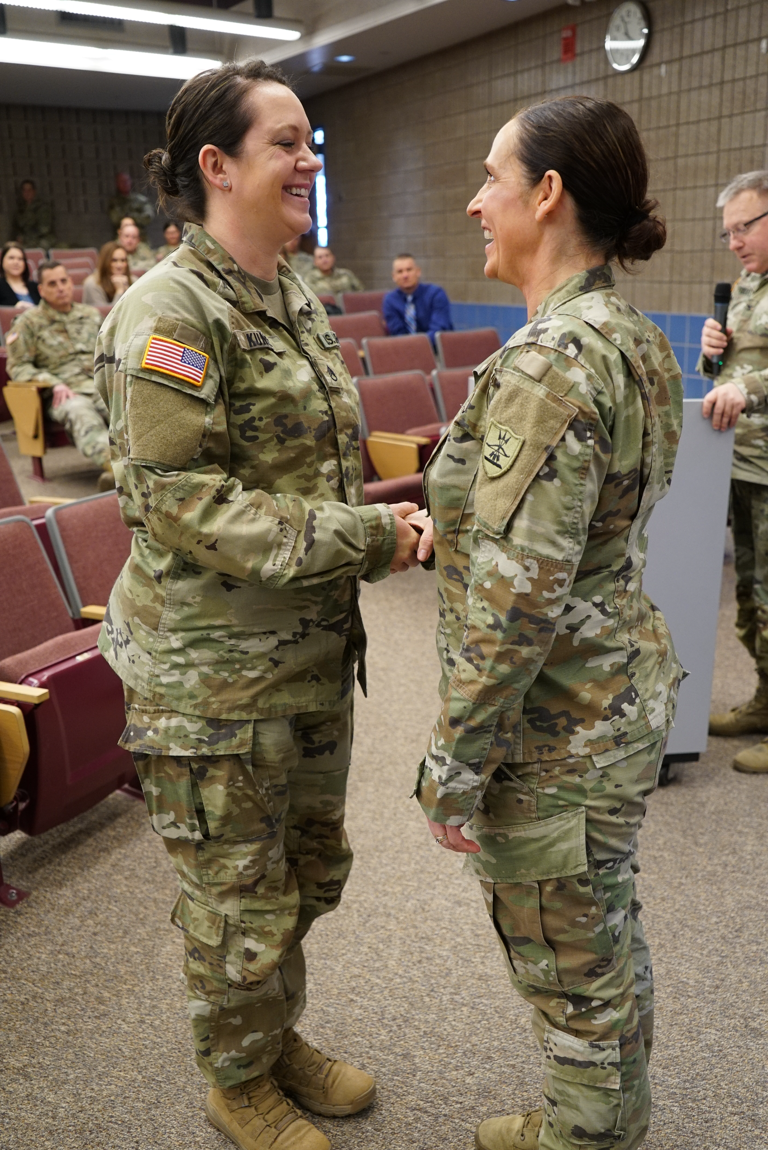 Brig. Gen. Jackie Huber, deputy adjutant general, right, presents Staff Sgt. Sara Kunick, Battery A, 1st Battalion, 188th Air Defense Artillery Regiment, a recognition coin, after professional development, Raymond J. Bohn armory, Bismarck, N.D., April 12, 2023.