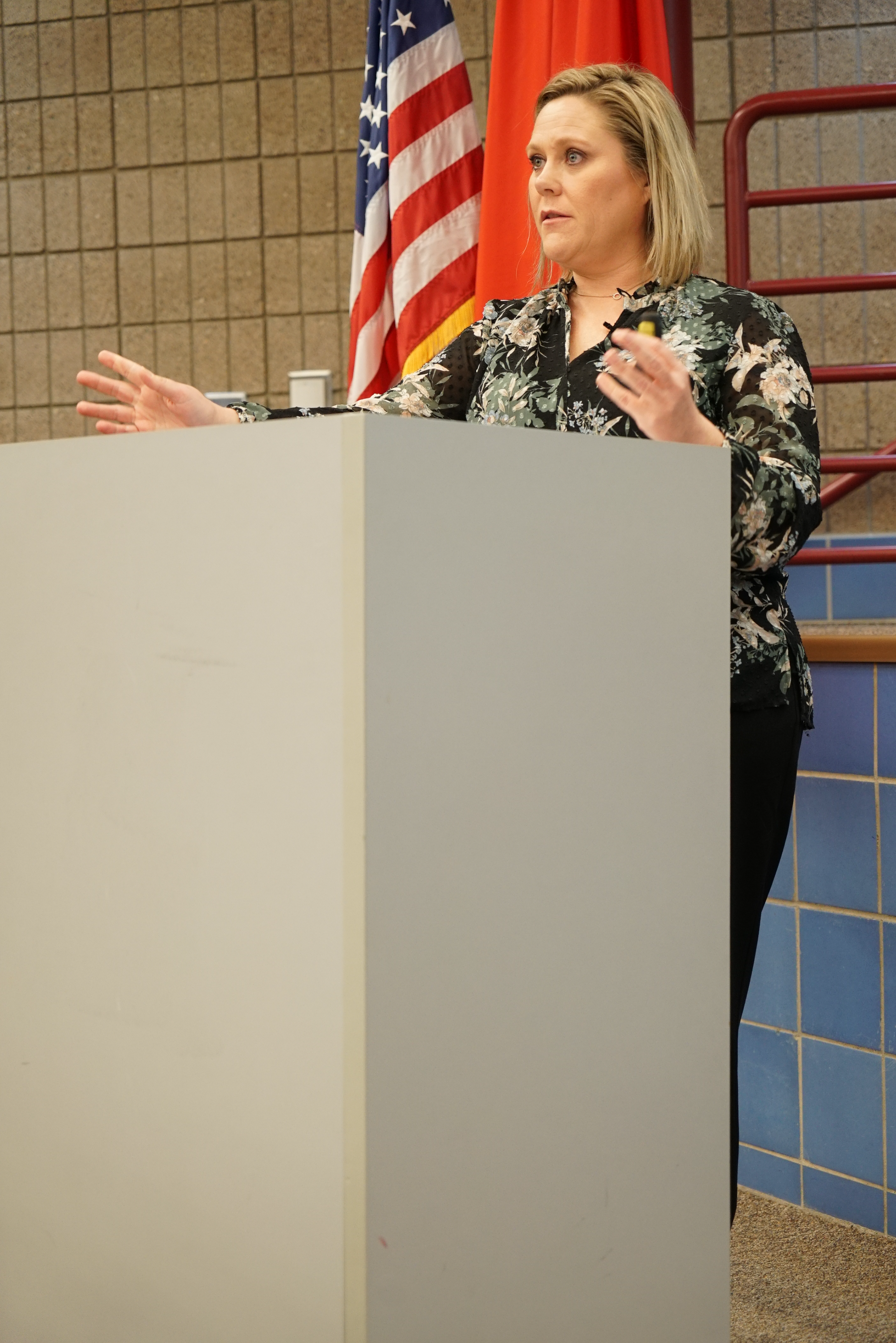 Erica Davison, sexual assault response coordinator (SARC), briefs full-time N.D. National Guard employees during this month's professional development, at Raymond J. Bohn armory, Bismarck, N.D., April 12, 2023.