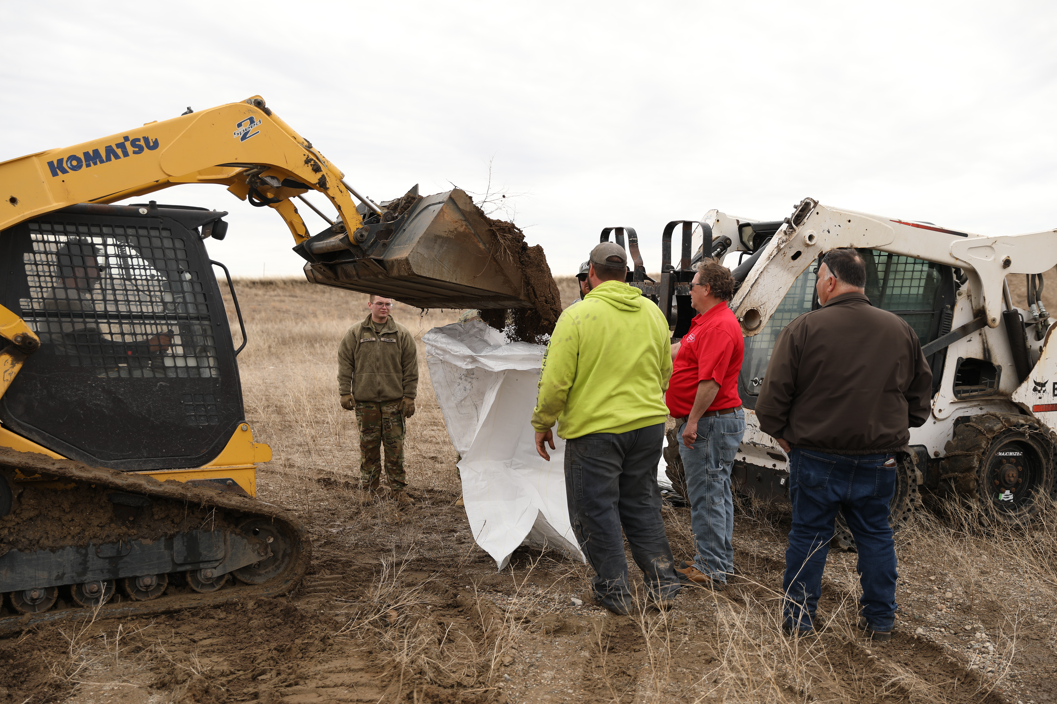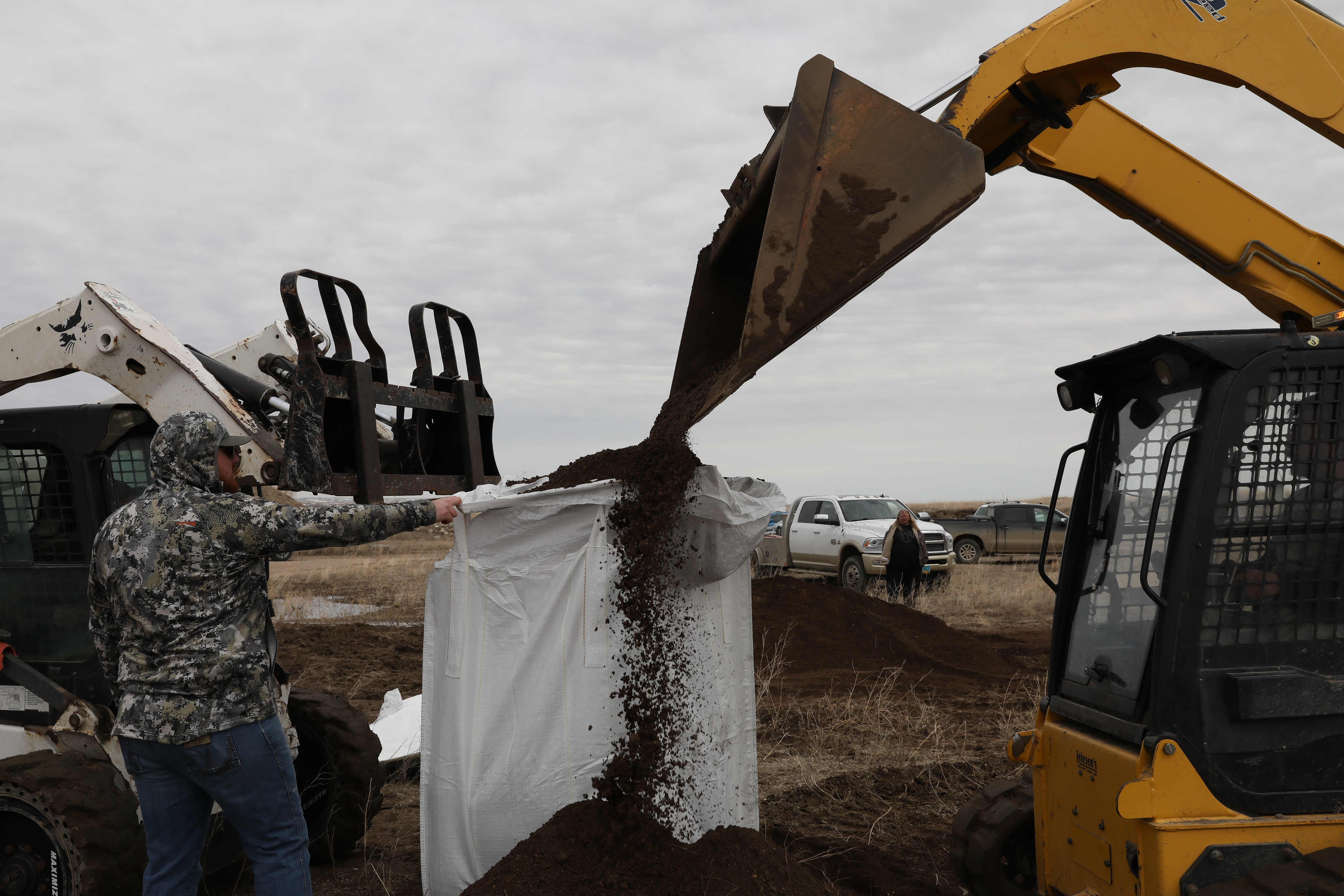 A loader fills a one-ton sandbag held open by a volunteer, April 12, 2023, White Earth, N.D.
