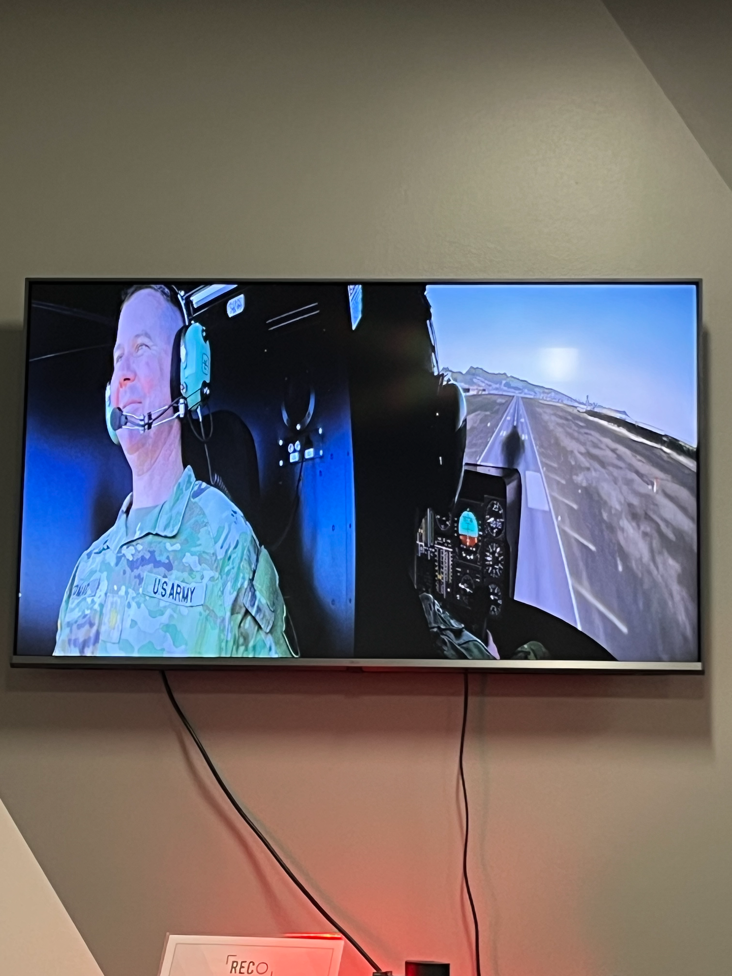 Maj. Waylon Tomac, S-3 officer, 68th Troop Command, along with 1st Battalion, 112th Aviation Regiment personnel, visited with 1st Battalion, 188th Air Defense Artillery Regiment, to help coordinate future training. While in Grand Forks the Soldiers visited the Global Aviation Training (GAT) at UND, a spatial disorientation trainer for helicopter pilots, March 30, 2023. (Photo by 1Lt. Justin Mayer, officer-in-charge, 1-112th AVN Rear Detachment )