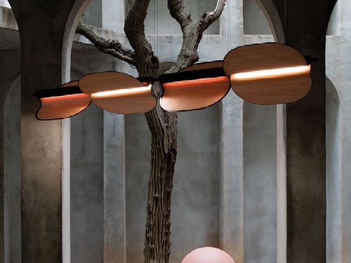 Omma is an inventive lamp, like a tree with fluttering leaves full of light. In Eli Gutierrez’s prepossessing design, it is almost possible to imagine the lamp’s movable wood veneer, artfully edged with metal, flapping in a gentle breeze. Omma is available as a suspension lamp (with two, or four leaves), a table lamp and a floor lamp (with a single leaf), and a wall lamp (with a single leaf). Individual leaves will rotate up to 180º, allowing the user to create a range of lighting moods.