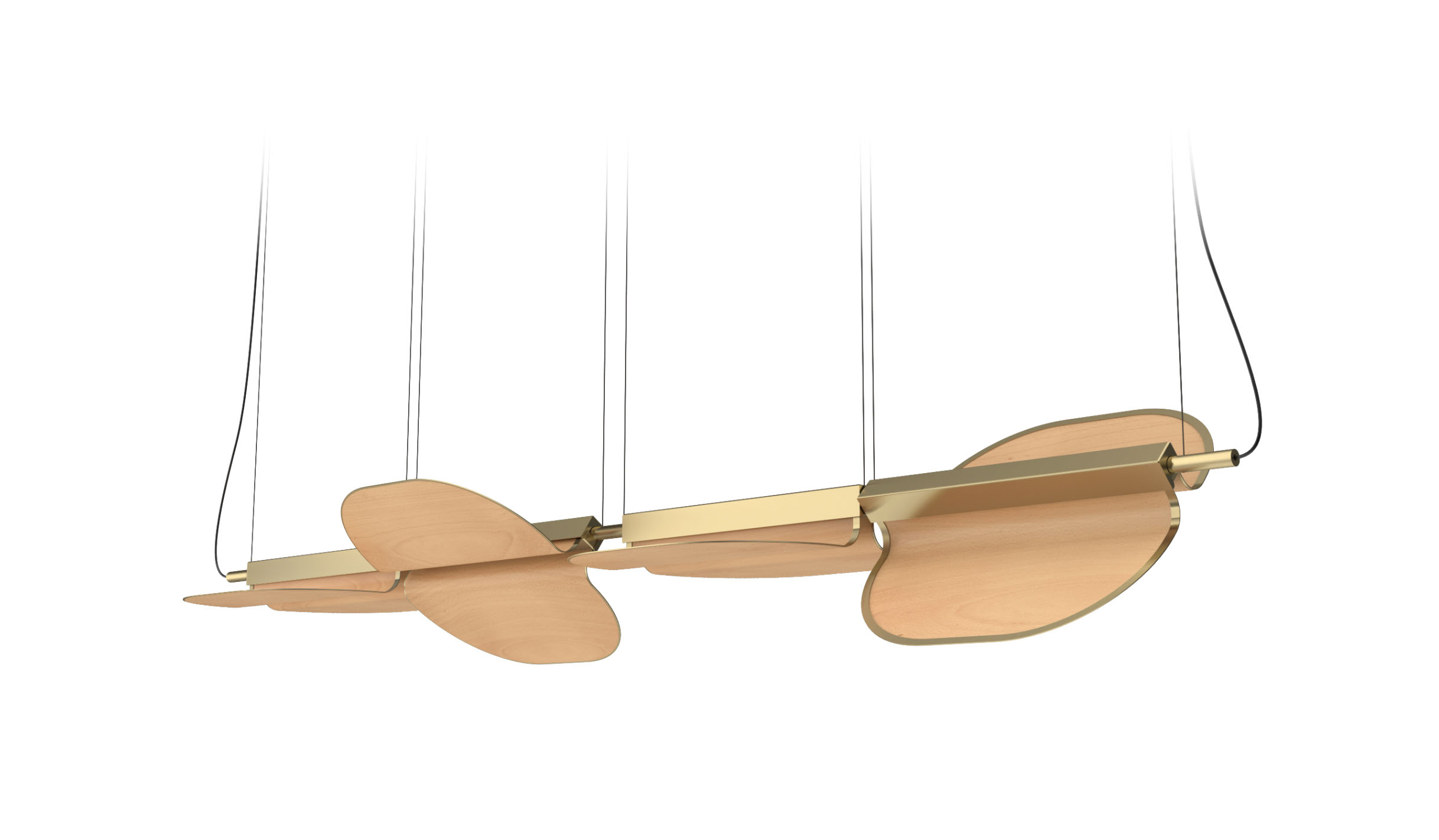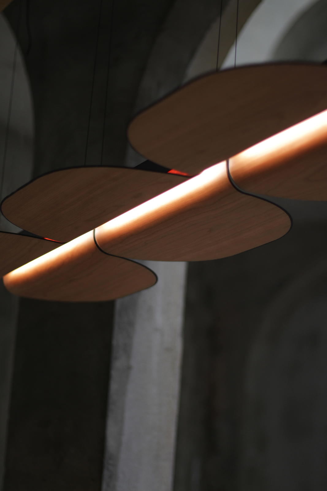 The Omma family of lights are available in only three wood veneer colours: Natural White, Natural Beech, and Natural Cherry. The lamp’s metal finishes (used to create the spine and to edge the wood veneer modules) include Matte Black and Gold.