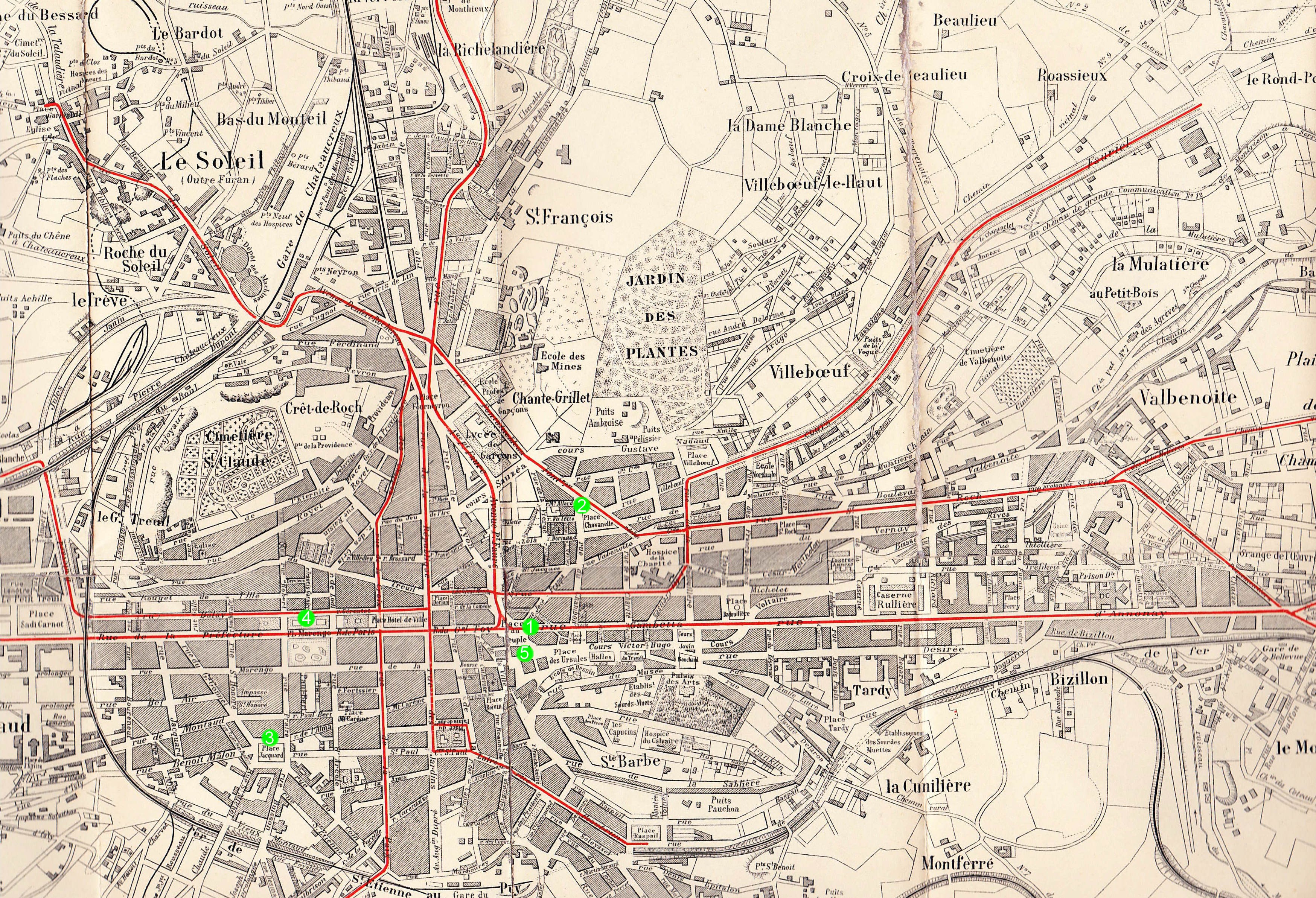 Notre promenade nous emmenera dans plusieurs endroits de la ville. Nous commencerons par la Place du peuple, puis chavanelle. Nous irons ensuite à jacquard et marengo. Enfin, nous terminerons par grenette.