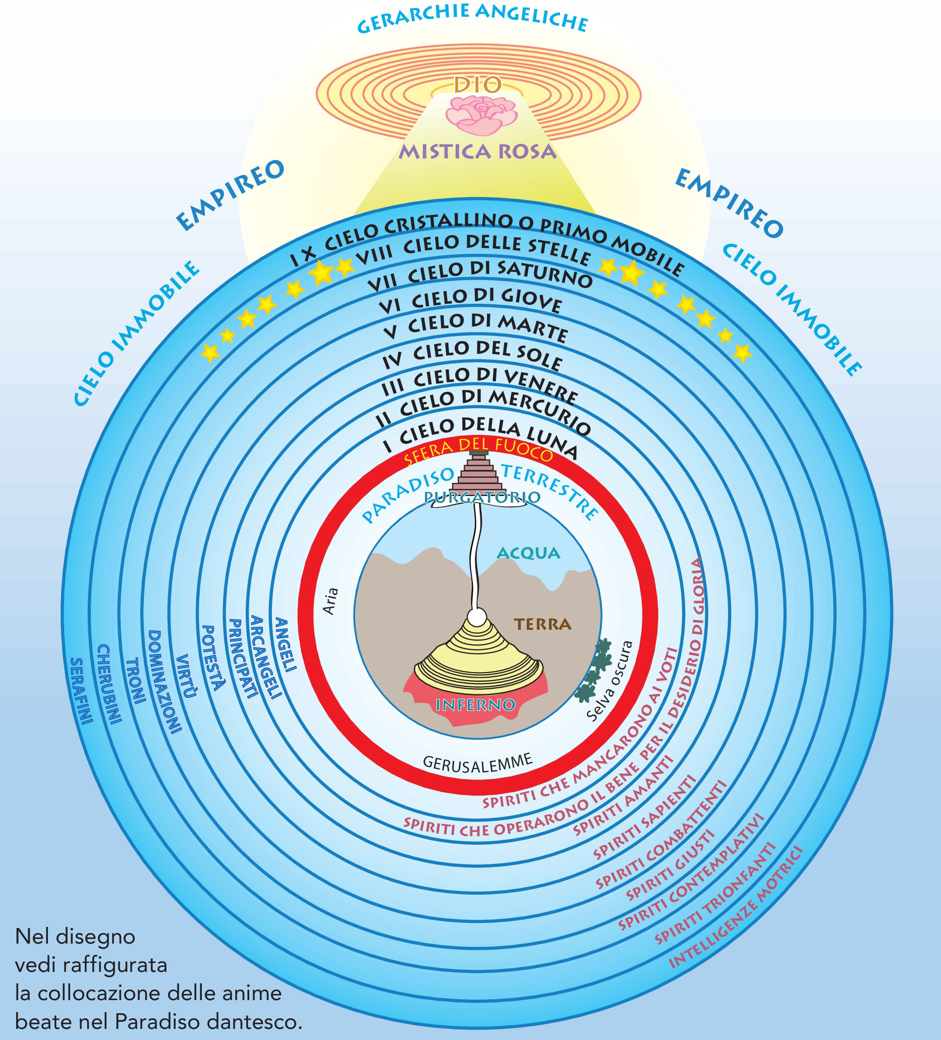 La cantica del Paradiso inizia e termina con una lode a Dio. Beatrice conduce Dante attraverso i 9 cieli del Paradiso, 9 sfere concentriche che sono mosse dagli angeli e producono un suono armonioso. I primi sette cieli sono: Luna, Mercurio, Venere, Sole, Marte, Giove e Saturno. Segue l'ottavo cielo, quello delle "Stelle Fisse" e poi il nono, detto "Primo Mobile". Oltre i 9 cieli si trova l''Empireo, sede di Dio e dei beati, disposti in una Candida Rosa intorno a Dio e alla Vergine Maria. Qui Beatrice viene sostituita da San Bernardo di Chiaravalle che accompagna Dante alla contemplazione di Dio e della Santissima Trinità.
