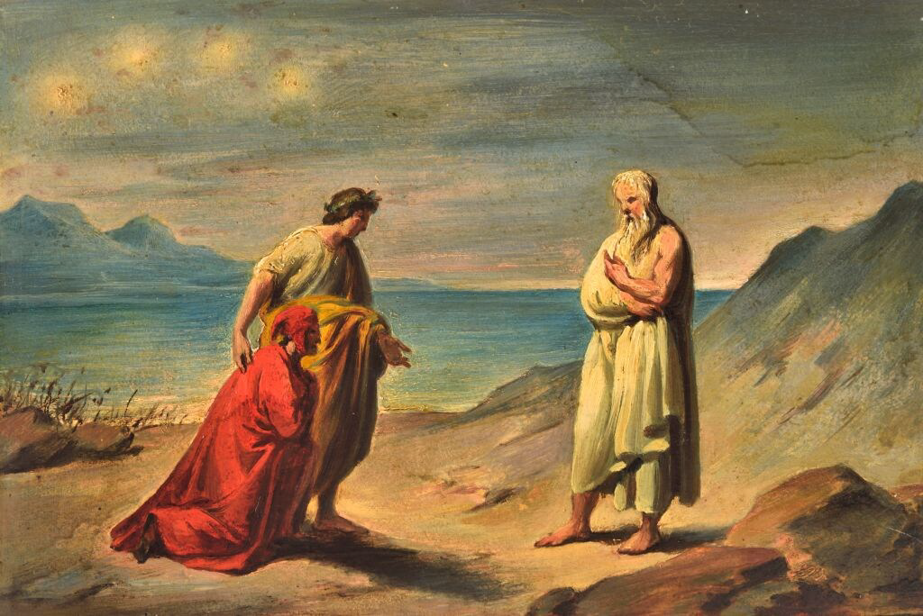 Dante e Virgilio, usciti dall'Inferno, si trovano in una spiaggia deserta dove appare loro un vecchio: Catone, il guardiano della montagna. Inizialmente Catone gli sbarra la strada, ma quando comprende che questo viaggio è volere divino li lascia passare. Alle porte del Paradiso terrestre, Virgilio deve abbandonare Dante perché non ha conosciuto la vera fede e non può procedere oltre e lo affida alla guida di Beatrice che lo conduce in Paradiso.