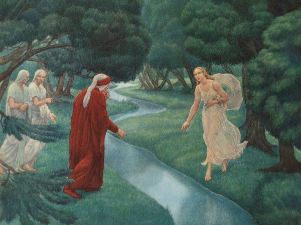 Nel mezzo della sua vita (35 anni), Dante racconta di essersi smarrito in una selva oscura perché si è allontanato dalla retta via. Inizia il suo viaggio alla ricerca della salvezza, incontra Virgilio, poeta latino e autore dell'Eneide. Virgilio era stato per Dante un maestro e fonte di ispirazione, per questo lo sceglie come sua prima guida in questo viaggio simbolico, ma reale.