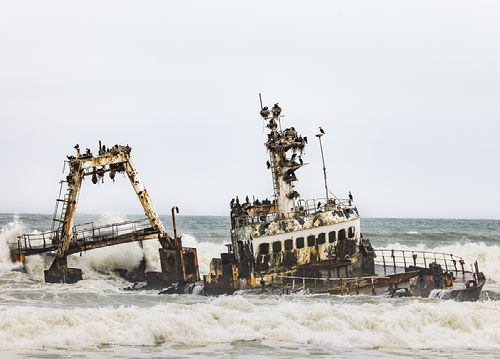 Le début de la skeletton coast. Les bateaux s'échouent sur les bancs de sable qui peuvent être à quelques centaires de mètres de la plage. Un paradis pour les cormorans qui les colonisent