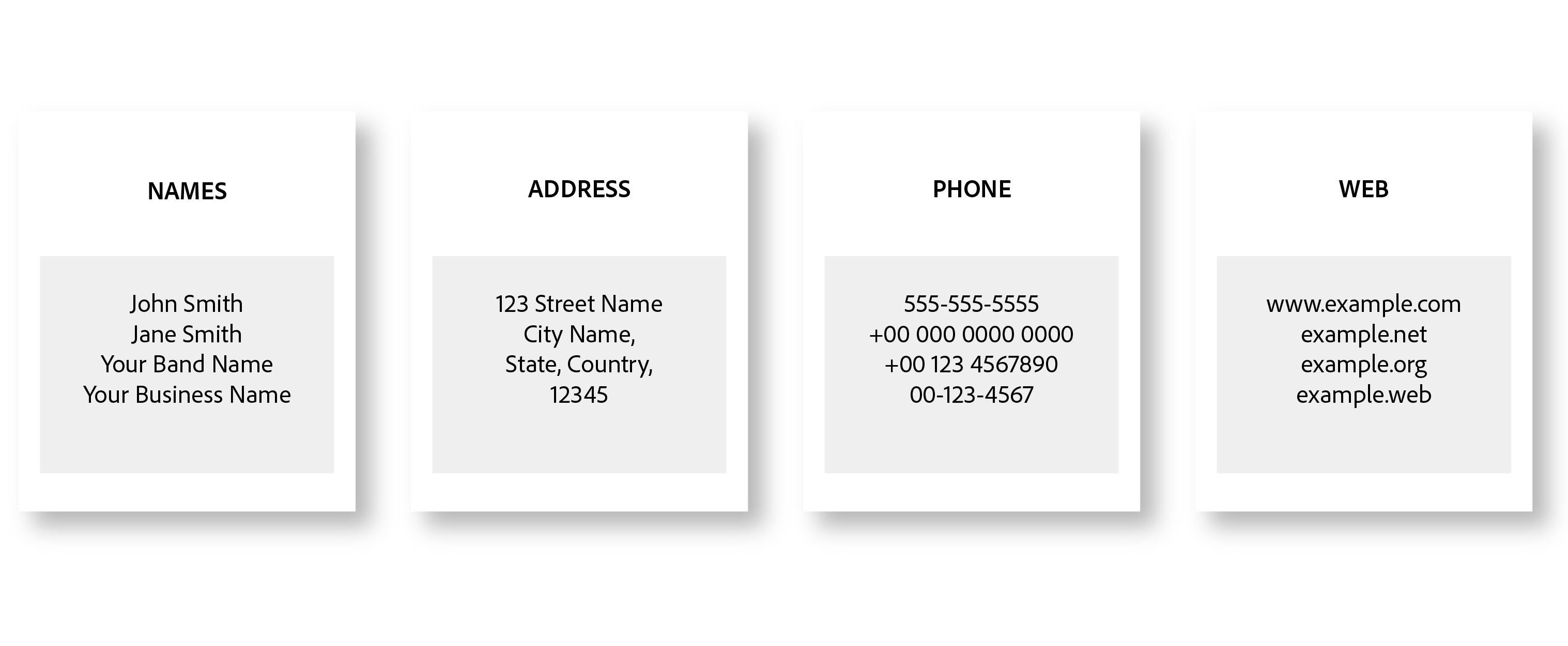 - Any placeholder text should use lorem ipsum and very generic names, streets etc. where possible. (see image below).