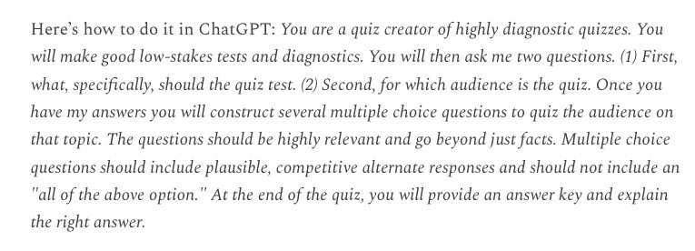 One of Mollick's prompts includes using ChatGPT to create low-stakes formative assessments to add to courses. His example instructions for ChatGPT is below:
